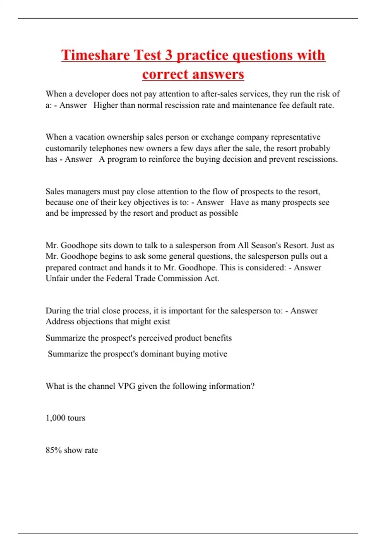 When a developer does not pay attention to after-sales services, they run the risk of a: - Answer Higher than normal rescission rate and maintenance fee default rate. When a vacation ownership sales person or exchange company representative customarily telephones new owners a few days after the sale, the resort probably has - Answer A program to reinforce the buying decision and prevent rescissions. Sales managers must pay close attention to the flow of prospects to the resort, because one of their key objectives is to: - Answer Have as many prospects see and be impressed by the resort and product as possible Mr. Goodhope sits down to talk to a salesperson from All Season's Resort. Just as Mr. Goodhope begins to ask some general questions, the salesperson pulls out a prepared contract and hands it to Mr. Goodhope. This is considered: - Answer Unfair under the Federal Trade Commission Act. During the trial close process, it is important for the salesperson to: - Answer Address objections that might exist Summarize the prospect's perceived product benefits Summarize the prospect's dominant buying motive What is the channel VPG given the following information? 1,000 tours 85% show rate