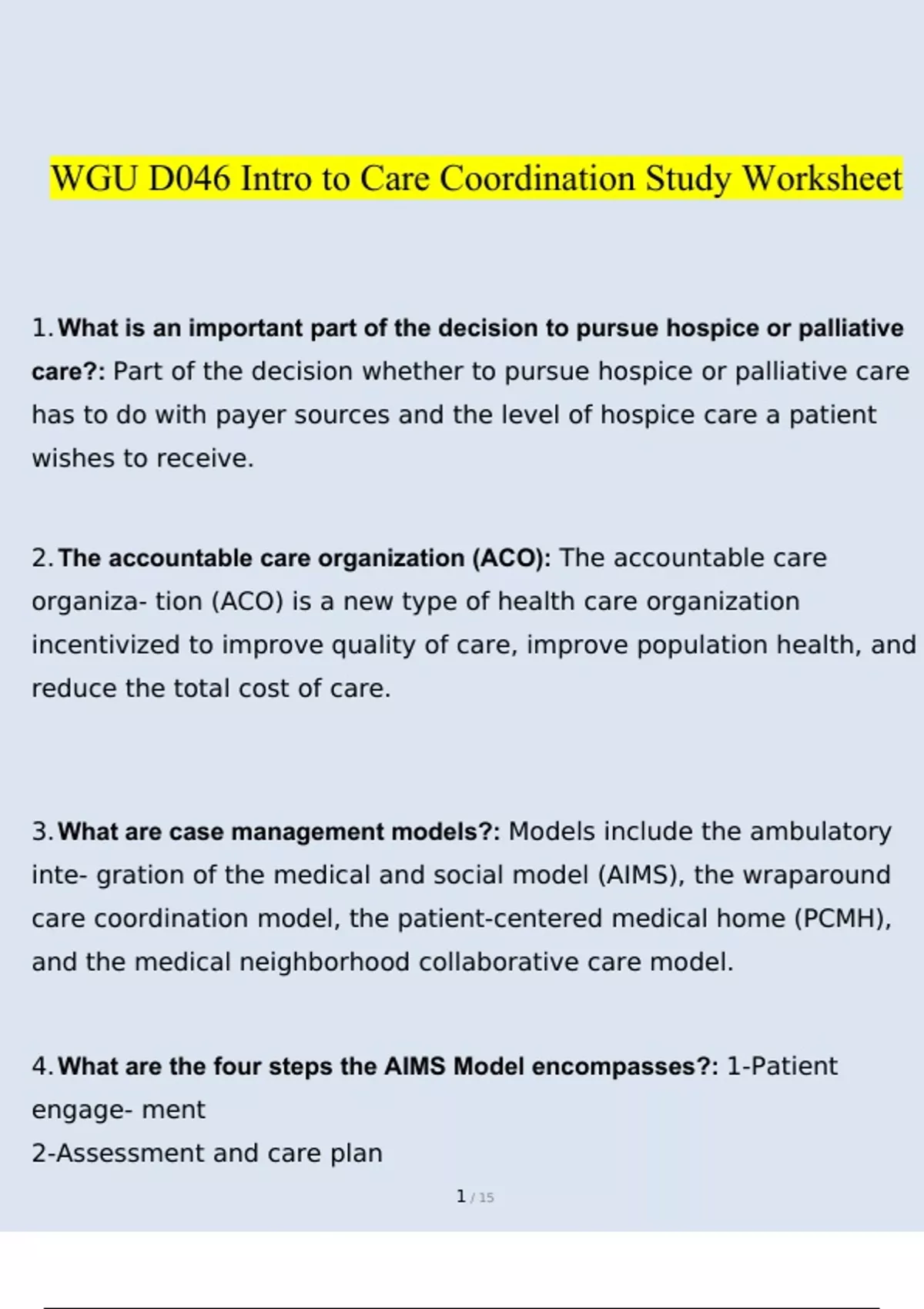 WGU D046 Intro to Care Coordination Study Worksheet 2023 Questions and Answers (Verified Answers) WGU D046 Intro to Care Coordination Study Worksheet 2023 Questions and Answers (Verified Answers)