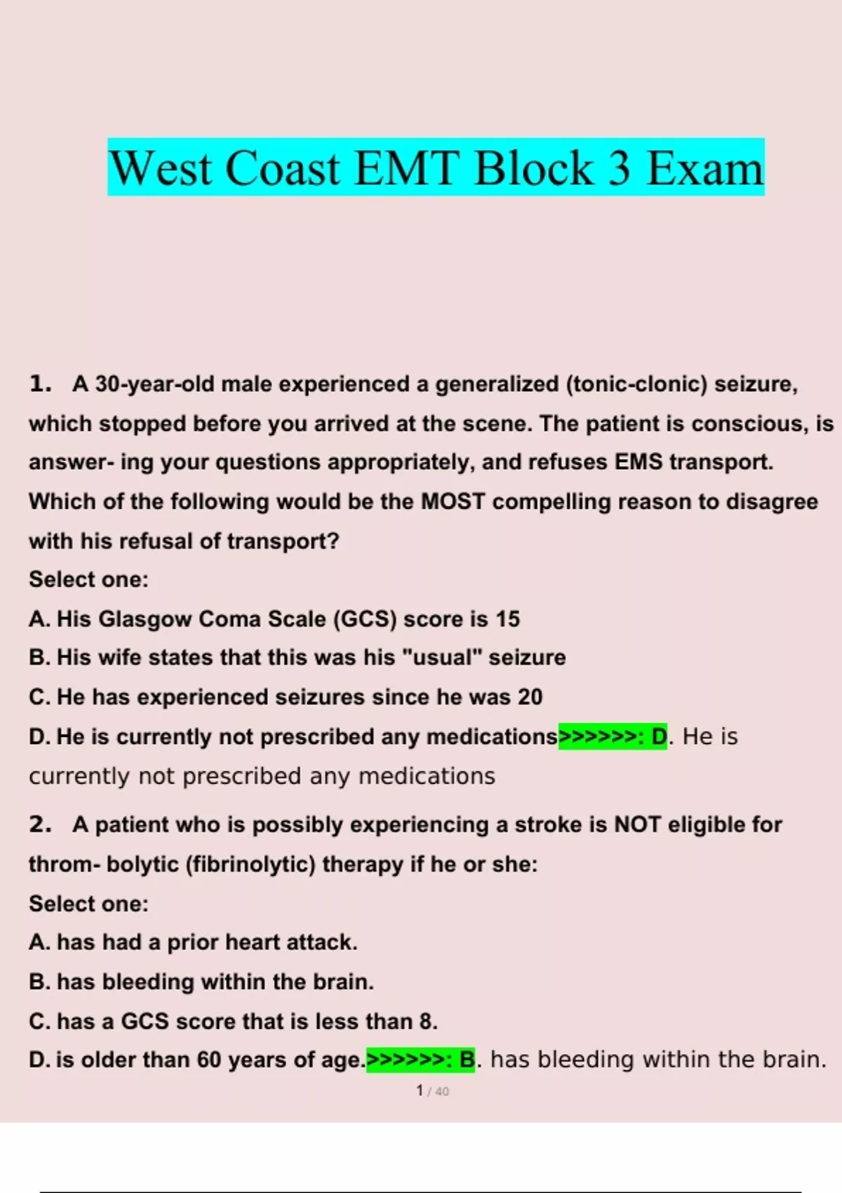 West Coast EMT Block Exam #3. questions verified with 100% correct answers