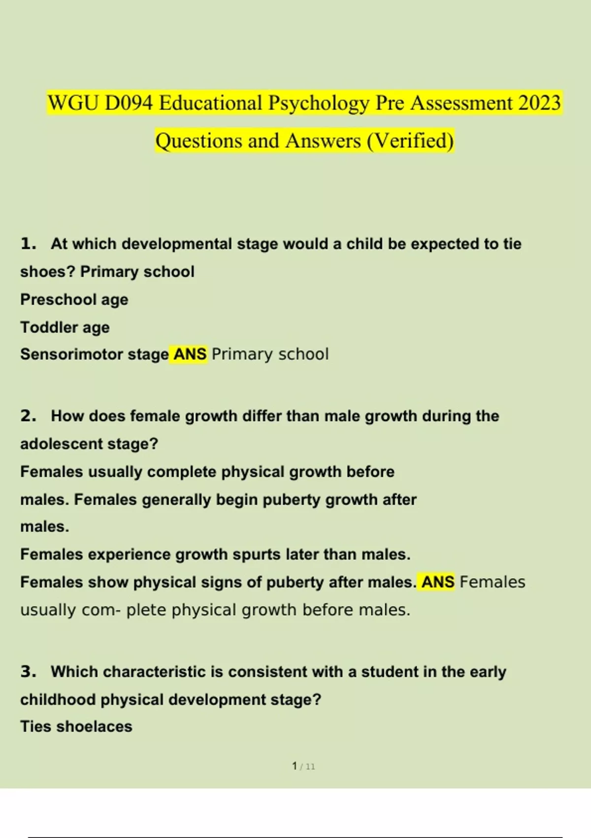 WGU D094 Educational Psychology Pre Assessment 2023 Questions and Answers (Verified) WGU D094 Educational Psychology Pre Assessment 2023 Questions and Answers (Verified)