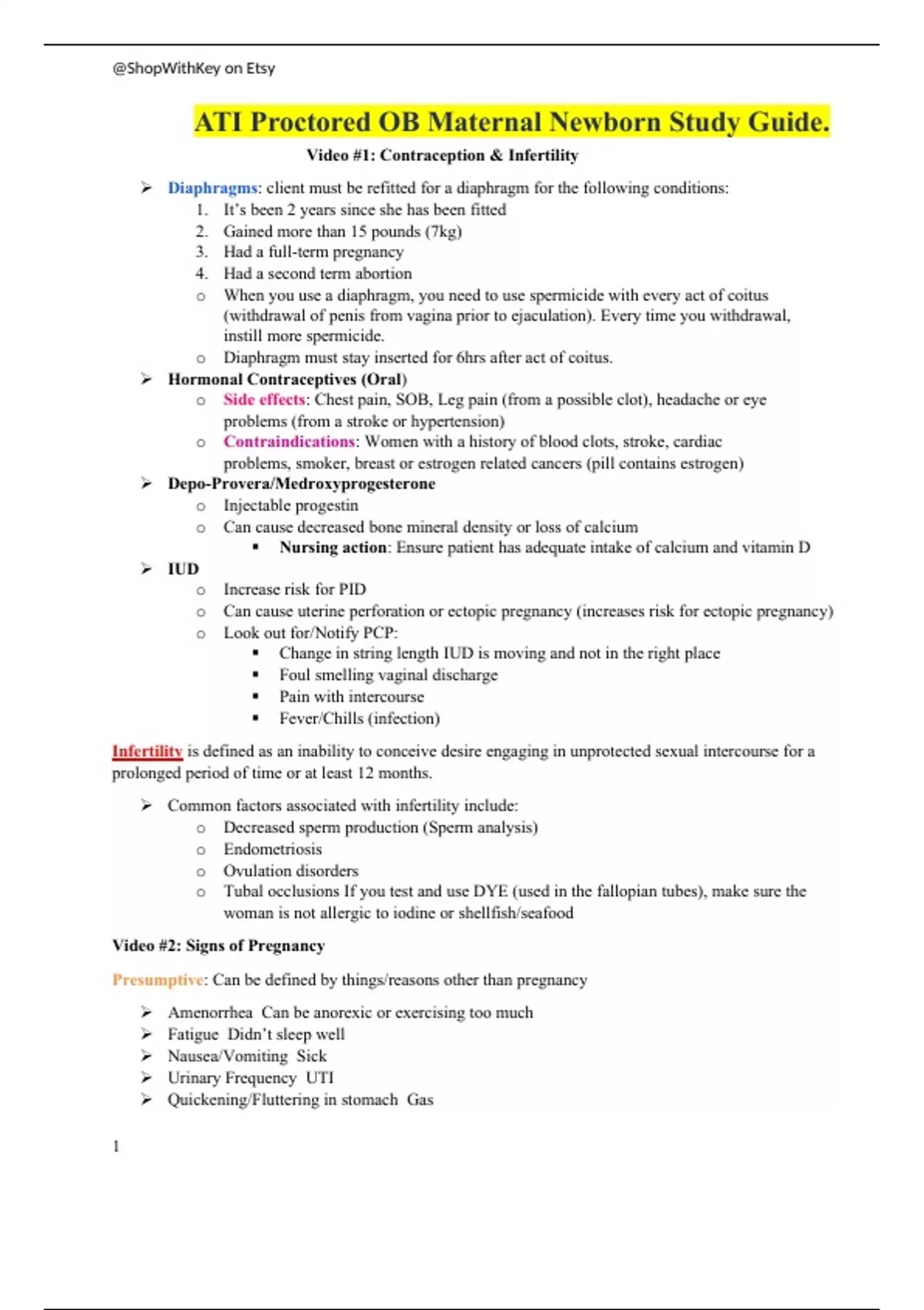 ATI Proctored OB Maternal Newborn Study Guide. Video #1: Contraception & Infertility Diaphragms: client must be refitted for a diaphragm for the following conditions: 1. It’s been 2 years since she has been fitted 2. Gained more than 15 pounds (7kg) 3. Had a full-term pregnancy 4. Had a second term abortion o When you use a diaphragm, you need to use spermicide with every act of coitus (withdrawal of penis from vagina prior to ejaculation). Every time you withdrawal, instill more spermicide. o Diaphragm must stay inserted for 6hrs after act of coitus. Hormonal Contraceptives (Oral) o Side effects: Chest pain, SOB, Leg pain (from a possible clot), headache or eye problems (from a stroke or hypertension) o Contraindications: Women with a history of blood clots, stroke, cardiac problems, smoker, breast or estrogen related cancers (pill contains estrogen) Depo-Provera/Medroxyprogesterone o Injectable progestin o Can cause decreased bone mineral density or loss of calcium Nursing action: Ensure patient has adequate intake of calcium and vitamin D IUD o Increase risk for PID o Can cause uterine perforation or ectopic pregnancy (increases risk for ectopic pregnancy) o Look out for/Notify PCP: Change in string length IUD is moving and not in the right place Foul smelling vaginal discharge Pain with intercourse Fever/Chills (infection) Infertility is defined as an inability to conceive desire engaging in unprotected sexual intercourse for a prolonged period of time or at least 12 months. Common factors associated with infertility include: o Decreased sperm production (Sperm analysis) o Endometriosis o Ovulation disorders o Tubal occlusions If you test and use DYE (used in the fallopian tubes), make sure the woman is not allergic to iodine or shellfish/seafood Video #2: Signs of Pregnancy Presumptive: Can be defined by things/reasons other than pregnancy Amenorrhea Can be anorexic or exercising too much Fatigue Didn’t sleep well Nausea/Vomiting Sick Urinary Frequency UTI Quickening/Fluttering in stomach Gas