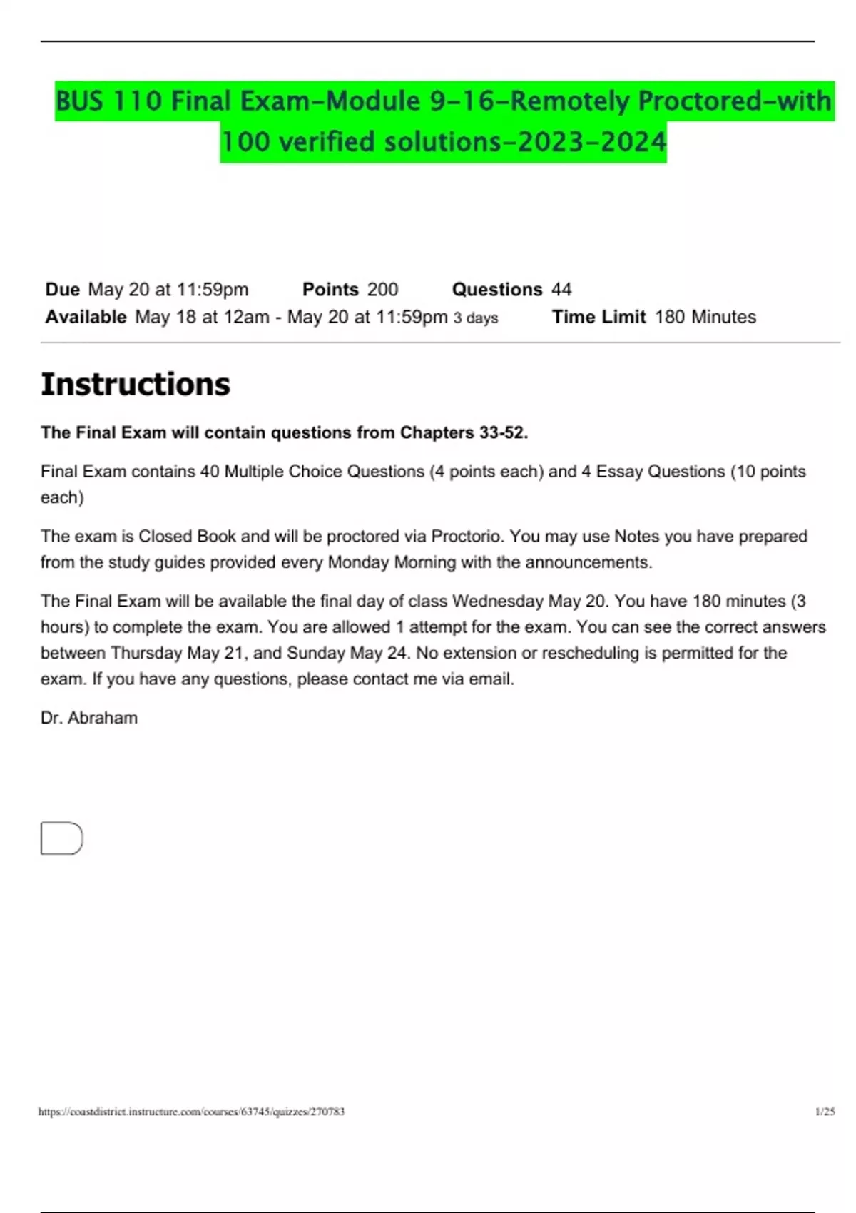 BUS 110 Final Exam-Module 9-16-Remotely Proctored-with 100 verified solutions-
