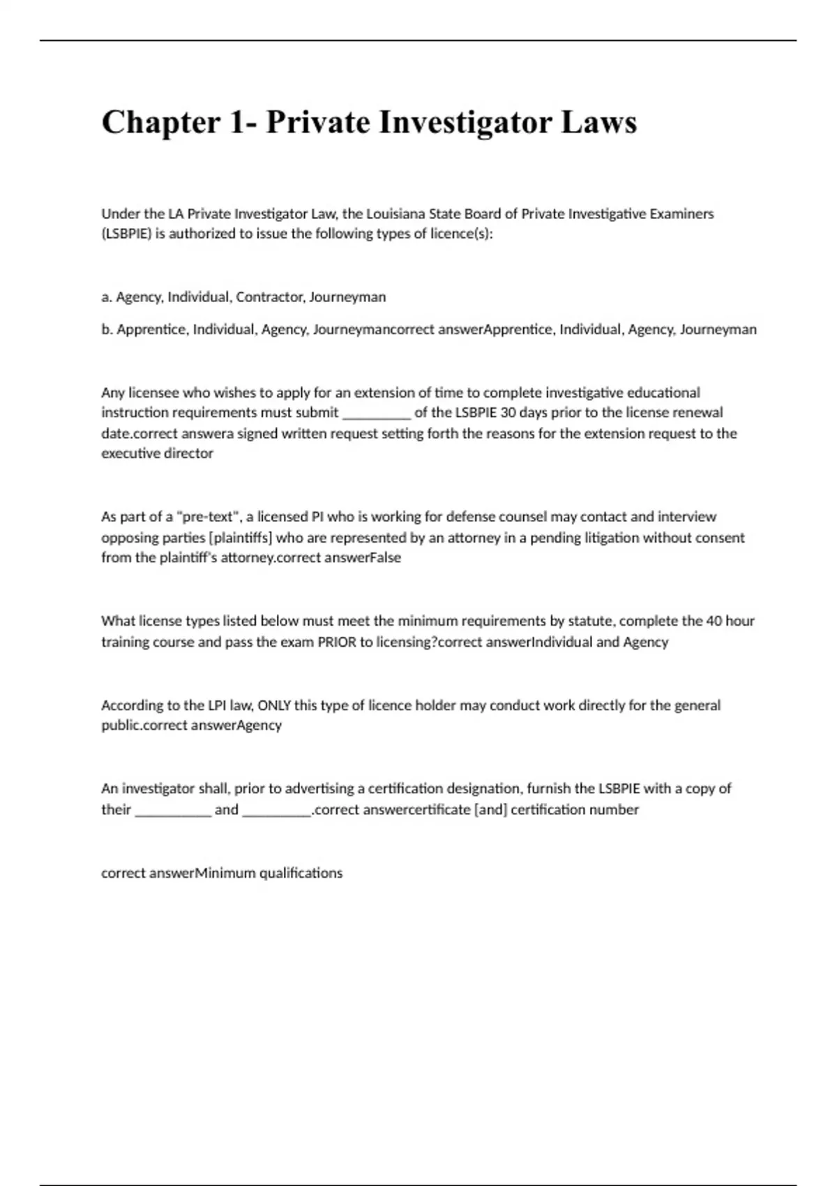 Under the LA Private Investigator Law, the Louisiana State Board of Private Investigative Examiners (LSBPIE) is authorized to issue the following types of licence(s): a. Agency, Individual, Contractor, Journeyman b. Apprentice, Individual, Agency, Journeyman Apprentice, Individual, Agency, Journeyman Any licensee who wishes to apply for an extension of time to complete investigative educational instruction requirements must submit _________ of the LSBPIE 30 days prior to the license renewal date. a signed written request setting forth the reasons for the extension request to the executive director As part of a "pre-text", a licensed PI who is working for defense counsel may contact and interview opposing parties [plaintiffs] who are represented by an attorney in a pending litigation without consent from the plaintiff's attorney. False What license types listed below must meet the minimum requirements by statute, complete the 40 hour training course and pass the exam PRIOR to licensing? Individual and Agency According to the LPI law, ONLY this type of licence holder may conduct work directly for the general public. Agency An investigator shall, prior to advertising a certification designation, furnish the LSBPIE with a copy of their __________ and _________. certificate [and] certification number ... Minimum qualifications