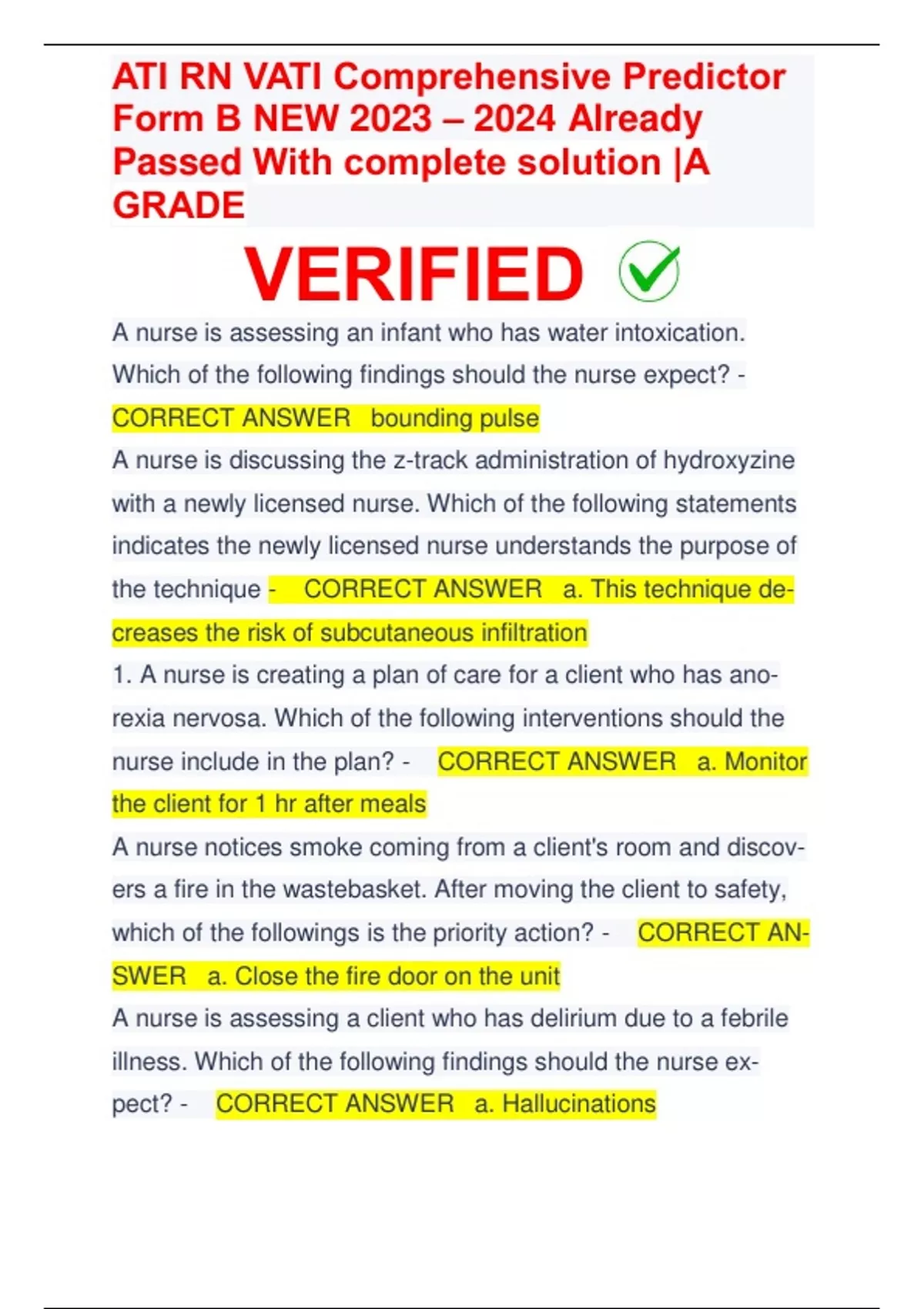 A nurse is assessing an infant who has water intoxication. Which of the following findings should the nurse expect? - CORRECT ANSWER bounding pulse A nurse is discussing the z-track administration of hydroxyzine with a newly licensed nurse. Which of the following statements indicates the newly licensed nurse understands the purpose of the technique - CORRECT ANSWER a. This technique de-creases the risk of subcutaneous infiltration 1. A nurse is creating a plan of care for a client who has ano-rexia nervosa. Which of the following interventions should the nurse include in the plan? - CORRECT ANSWER a. Monitor the client for 1 hr after meals A nurse notices smoke coming from a client's room and dis-covers a fire in the wastebasket. After moving the client to safety, which of the followings is the priority action? - COR-RECT ANSWER a. Close the fire door on the unit A nurse is assessing a client who has delirium due to a febrile illness. Which of the following findings should the nurse ex-pect? - CORRECT ANSWER a. Hallucinations