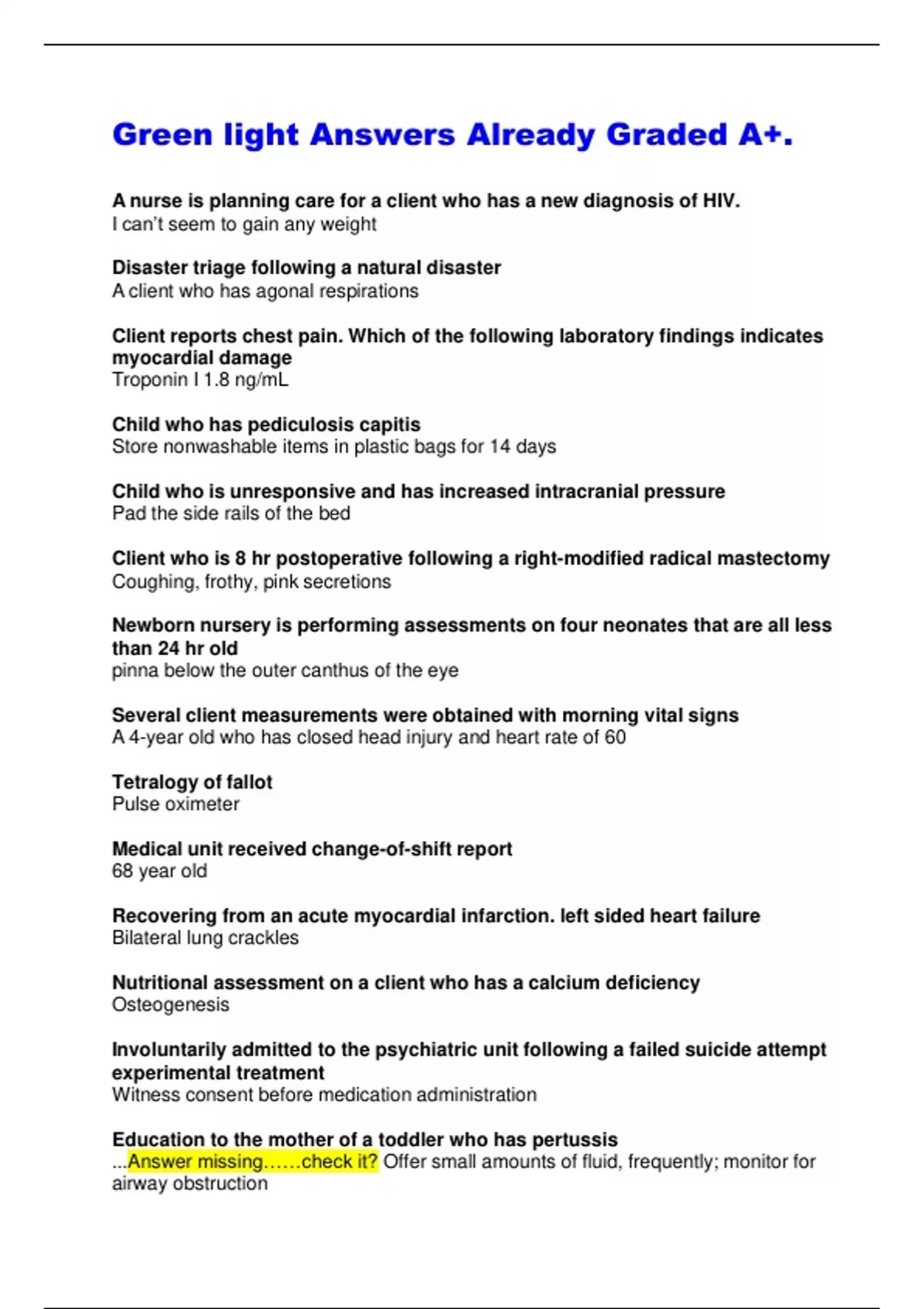 Green light Answers Already Graded A+. A nurse is planning care for a client who has a new diagnosis of HIV. I can’t seem to gain any weight Disaster triage following a natural disaster A client who has agonal respirations Client reports chest pain. Which of the following laboratory findings indicates myocardial damage Troponin I 1.8 ng/mL Child who has pediculosis capitis Store nonwashable items in plastic bags for 14 days Child who is unresponsive and has increased intracranial pressure Pad the side rails of the bed Client who is 8 hr postoperative following a right-modified radical mastectomy Coughing, frothy, pink secretions Newborn nursery is performing assessments on four neonates that are all less than 24 hr old pinna below the outer canthus of the eye Several client measurements were obtained with morning vital signs A 4-year old who has closed head injury and heart rate of 60 Tetralogy of fallot Pulse oximeter Medical unit received change-of-shift report 68 year old Recovering from an acute myocardial infarction. left sided heart failure Bilateral lung crackles Nutritional assessment on a client who has a calcium deficiency Osteogenesis Involuntarily admitted to the psychiatric unit following a failed suicide attempt experimental treatment Witness consent before medication administration Education to the mother of a toddler who has pertussis ...Answer missing……check it? Offer small amounts of fluid, frequently; monitor for airway obstruction School nurse scabies Red itchy papules on child’s groin area Diabetes insipidus DI severe head injury Urine output 250 ml 2 hr postoperative following an ileal conduit procedure bladder cancer Dusky colored stoma Mastitis of left breast does this mean that I must stop nursing my baby No, you can continue to nurse from both your breasts