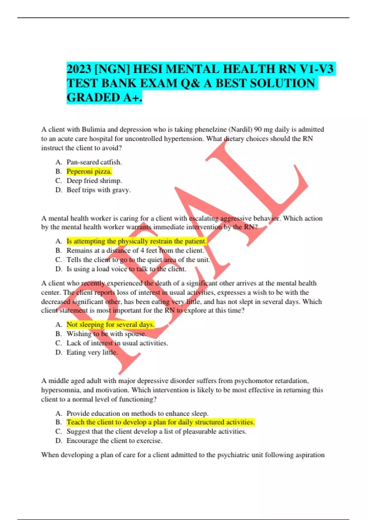 2023 [NGN] HESI MENTAL HEALTH RN V1-V3 TEST BANK EXAM Q& A BEST SOLUTION GRADED A+.