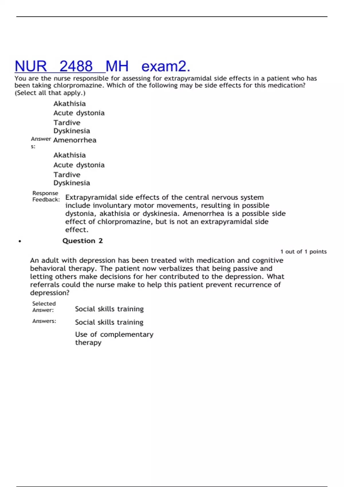 NUR 2488 MH exam2. You are the nurse responsible for assessing for extrapyramidal side effects in a patient who has been taking chlorpromazine. Which of the following may be side effects for this medication? (Select all that apply.) Akathisia Acute dystonia Tardive Dyskinesia Answer Amenorrhea s: Akathisia Acute dystonia Tardive Dyskinesia Response Feedback: Extrapyramidal side effects of the central nervous system include involuntary motor movements, resulting in possible dystonia, akathisia or dyskinesia. Amenorrhea is a possible side effect of chlorpromazine, but is not an extrapyramidal side effect. •Question 2 1 out of 1 points An adult with depression has been treated with medication and cognitive behavioral therapy. The patient now verbalizes that being passive and letting others make decisions for her contributed to the depression. What referrals could the nurse make to help this patient prevent recurrence of depression? Selected Answer: Social skills training Answers: Social skills training Use of complementary therapy Response Feedback : Relaxation training classes Learning desensitization techniques Social skills training is helpful in treating and preventing the recurrence of depression. Training focuses on assertiveness and coping skills that lead to positive reinforcement from others. Use of complementary therapy refers to adjunctive therapies such as herbals. Assertiveness would be of greater value than relaxation training because passivity has been identified as a concern. Desensitization is used in treatment of phobias •Question 3 A patient with suicidal impulses is placed on the highest level of suicide 1 out of 1 points precautions. Which measures should be incorporated into the plan of care by the nurse caring for the patient? (Select all that apply.) Selected Answers: Maintain arm’s-length distance, institute one-on-one nursing observation around the clock Allow no glass or metal on meal trays Remove all potentially harmful objects from the patient’s possession Answers: Maintain arm’s-length distance, institute one-on-one nursing observation around the clock Allow no glass or metal on meal trays Keep patient within visual range while awake, but only check every 15 to 30 minutes while the patient is sleeping Only check the patient’s whereabouts every 15 minutes and make frequent verbal contacts. Remove all potentially harmful objects from the patient’s possession Response Feedback : One-on-one observation is necessary for anyone who has limited control over suicidal impulses. Plastic dishes on trays and the removal of potentially harmful objects from the patient’s possession are measures included in any-level suicide precautions. The remaining options are used in less stringent levels of suicide precautions.