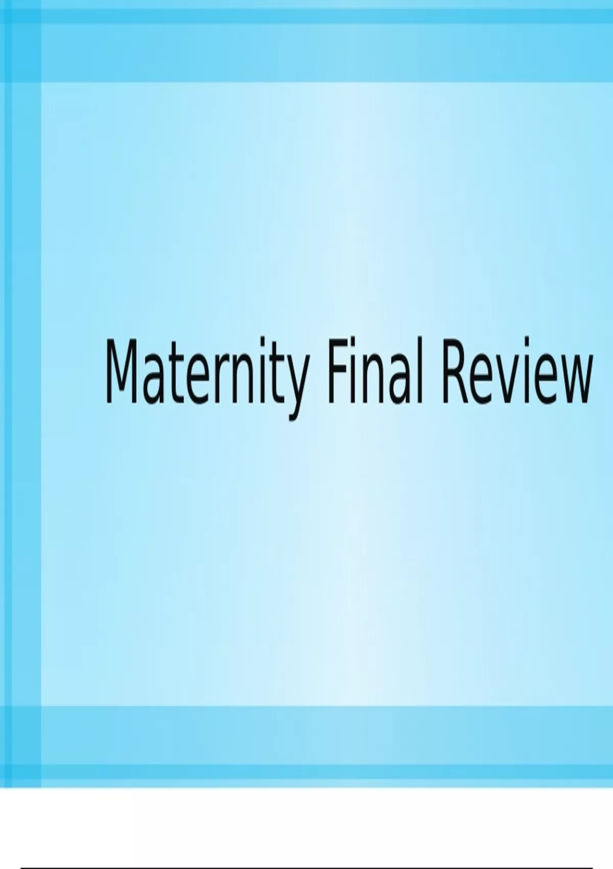 Maternity Final Review Nursing Process • Assess – must assess 1st before performing an intervention! • Diagnose • Plan • Interventions • Evaluate • What is the most common reportable STD in the United States? Chlamydia • Do you have to have intercourse to get an STI? Nope • What is the most common STD (overall)? HPV - vaccine 11-26, both males and females can get it • Are there any specific concerns we need to warn women about while taking Flagyl regarding consuming alcohol? Yes – the woman will get very sick if she drinks while taking Flagyl. N/V • Is there a pH difference between Candidiasis, Bacterial Vaginosis and Trichomoniasis? If so what is it for all three? Yes, BV and Trichomoniasis: pH > 4.5 - abnormal, Candidiasis (fungal infection) vaginal pH won’t change • Which of the following best describes the clinical signs/symptoms of chlamydial infection in woman? a. Most women are asymptomatic – a lot of STD’s esp. in the beginning which makes it easy to transmit to others b. Most women complain of a discharge c. Most women complain of pelvic pain d. Most women complain of urinary symptoms • Mucocutaneous lesions and rash are most commonly seen during which stage of syphilis? a. Latent b. Primary – painless sore, chancre, think its an engrone hair c. Secondary d. Tertiary • Which of the STIs have an available vaccine? Hep B, HPV, Hep A (not transmitted sexually) • Do condoms protect against all STIs? No • Is HIV testing required for all pregnant women? What if women does not want to be tested? • Not required. Woman must opt out. Educate on risk of transmission to fetus. • If you had a woman who was high risk for HIV infection “opt-out” of testing – what might you educate her on? Risk of transmission to her baby. • The risk of perinatal transmission of HIV can be reduced with antiretroviral treatment. Identification in the preconception period is essential. Which of the following statements about HIV screening in pregnancy is most accurate? Pregnant women: a. Are routinely screened for HIV with all prenatal lab testing b. Must be given the option to opt out of routine HIV testing c. Must provide written consent for HIV screening d. Should be offered HIV screening in each trimester