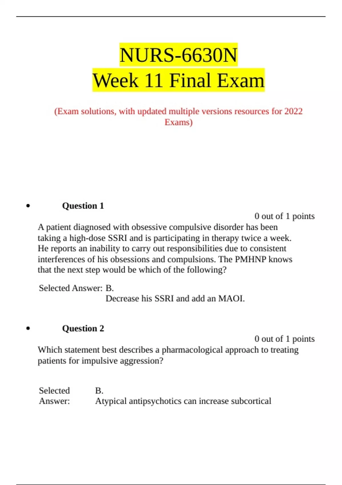 NURS-6630N Week 11 Final Exam (Exam solutions, with updated multiple versions resources for 2022 Exams) Question 1 0 out of 1 points A patient diagnosed with obsessive compulsive disorder has been taking a high-dose SSRI and is participating in therapy twice a week. He reports an inability to carry out responsibilities due to consistent interferences of his obsessions and compulsions. The PMHNP knows that the next step would be which of the following? Selected Answer: B. Decrease his SSRI and add an MAOI. Question 2 0 out of 1 points Which statement best describes a pharmacological approach to treating patients for impulsive aggression? Selected Answer: B. Atypical antipsychotics can increase subcortical dopaminergic stimulation. Question 3 1 out of 1 points The PMHNP evaluates a patient presenting with symptoms of dementia. Before the PMHNP considers treatment options, the patient must be assessed for other possible causes of dementia. Which of the following answers addresses both possible other causes of dementia and a rational treatment option for Dementia? Selected Answer: B. Possible other causes: hypothyroidism, adrenal insufficiency, hyperparathyroidism Possible treatment option: donepezil Question 4 1 out of 1 points An 80-year-old female patient diagnosed with Stage II Alzheimer’s has a history of irritable bowel syndrome. Which cholinergic drug may be the best choice for treatment given the patient’s gastrointestinal problems? Selected Answer: A. Donepezil (Aricept)