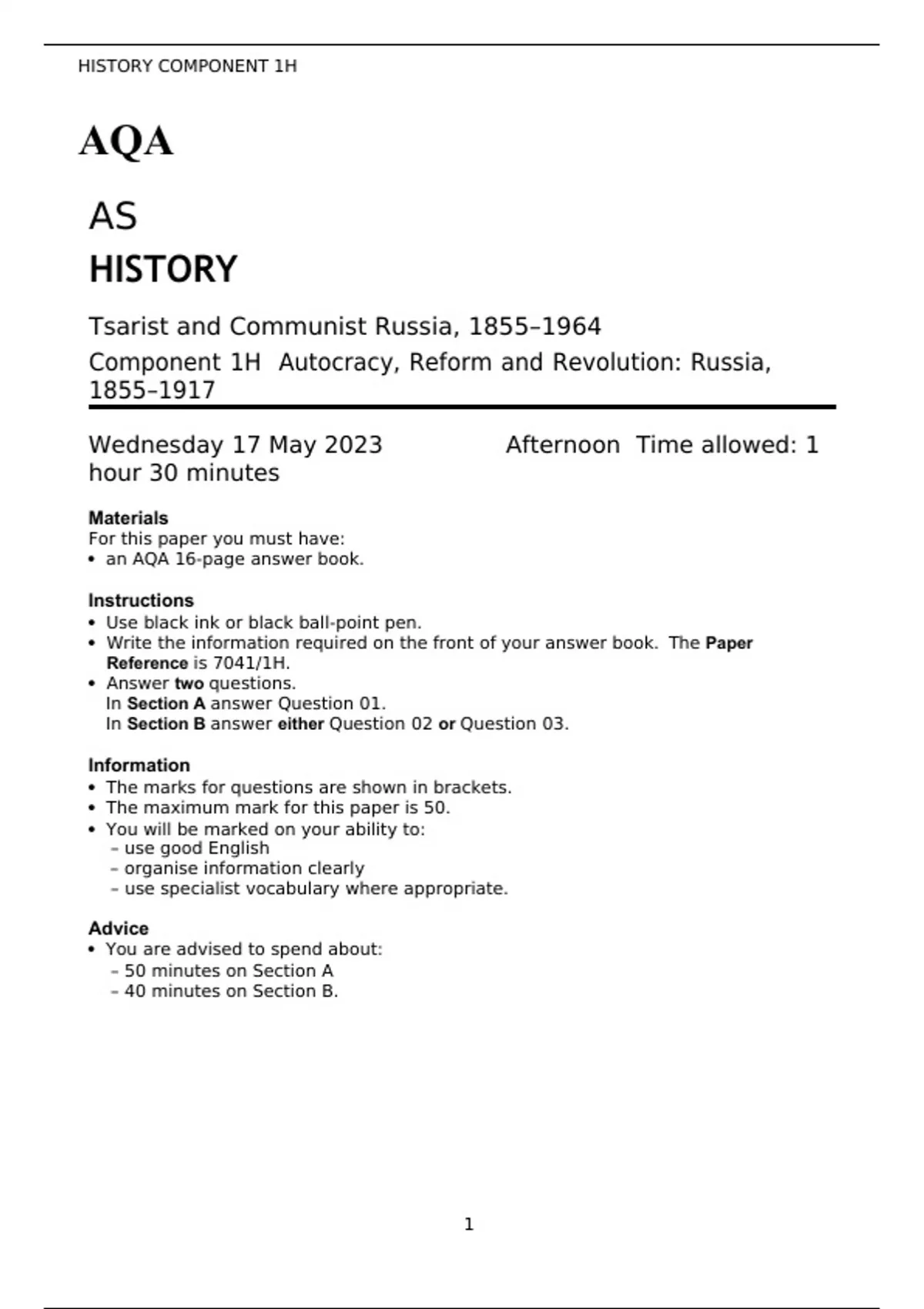 Component 1H Autocracy, Reform and Revolution: Russia,