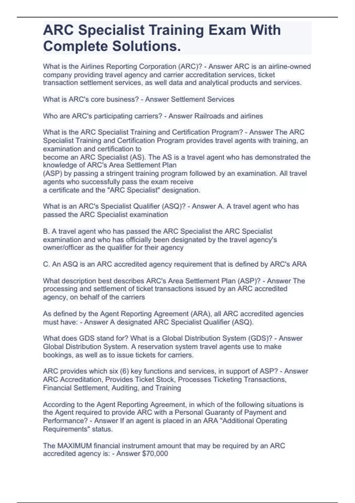 ARC Specialist Training Exam With Complete Solutions.