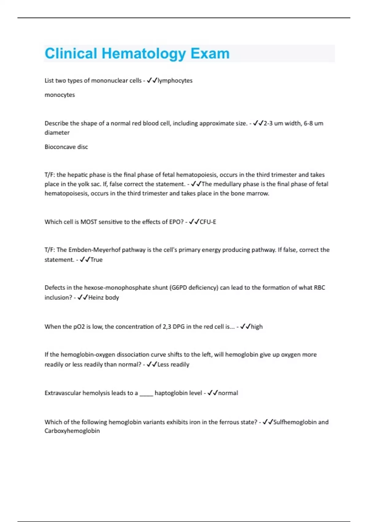 List two types of mononuclear cells - lymphocytes monocytes Describe the shape of a normal red blood cell, including approximate size. - 2-3 um width, 6-8 um diameter Bioconcave disc T/F: the hepatic phase is the final phase of fetal hematopoiesis, occurs in the third trimester and takes place in the yolk sac. If, false correct the statement. - The medullary phase is the final phase of fetal hematopoisesis, occurs in the third trimester and takes place in the bone marrow. Which cell is MOST sensitive to the effects of EPO? - CFU-E T/F: The Embden-Meyerhof pathway is the cell's primary energy producing pathway. If false, correct the statement. - True Defects in the hexose-monophosphate shunt (G6PD deficiency) can lead to the formation of what RBC inclusion? - Heinz body When the pO2 is low, the concentration of 2,3 DPG in the red cell is... - high If the hemoglobin-oxygen dissociation curve shifts to the left, will hemoglobin give up oxygen more readily or less readily than normal? - Less readily Extravascular hemolysis leads to a ____ haptoglobin level - normal Which of the following hemoglobin variants exhibits iron in the ferrous state? - Sulfhemoglobin and CarboxyhemoglobinT/F: sickle cells can only be formed when hemoglobin is in the tense state. If false correct the statement. - True