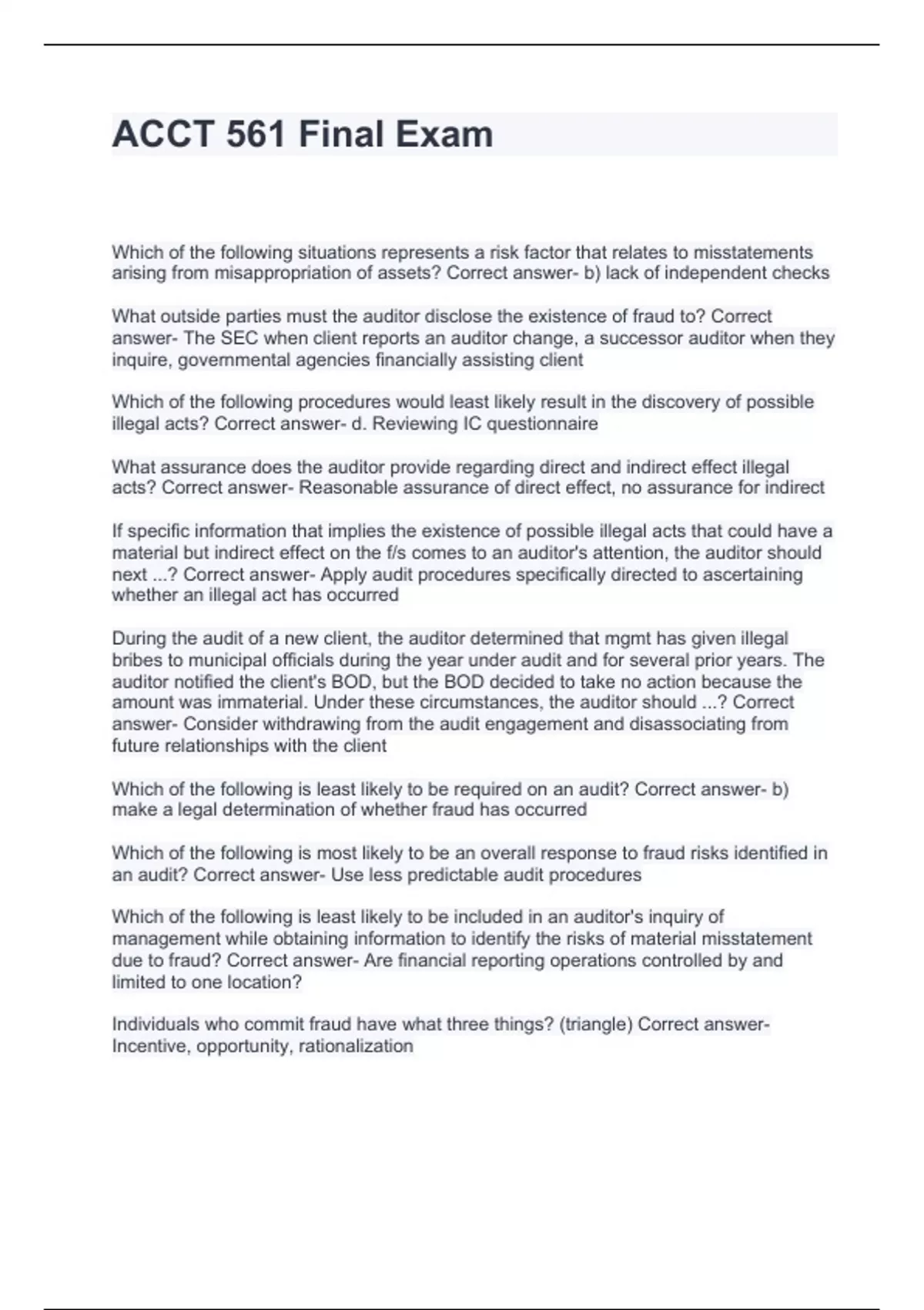 ACCT 561 Final Exam Which of the following situations represents a risk factor that relates to misstatements arising from misappropriation of assets? Correct answer- b) lack of independent checks What outside parties must the auditor disclose the existence of fraud to? Correct answer- The SEC when client reports an auditor change, a successor auditor when they inquire, governmental agencies financially assisting client Which of the following procedures would least likely result in the discovery of possible illegal acts? Correct answer- d. Reviewing IC questionnaire What assurance does the auditor provide regarding direct and indirect effect illegal acts? Correct answer- Reasonable assurance of direct effect, no assurance for indirect If specific information that implies the existence of possible illegal acts that could have a material but indirect effect on the f/s comes to an auditor's attention, the auditor should next ...? Correct answer- Apply audit procedures specifically directed to ascertaining whether an illegal act has occurred During the audit of a new client, the auditor determined that mgmt has given illegal bribes to municipal officials during the year under audit and for several prior years. The auditor notified the client's BOD, but the BOD decided to take no action because the amount was immaterial. Under these circumstances, the auditor should ...? Correct answer- Consider withdrawing from the audit engagement and disassociating from future relationships with the client Which of the following is least likely to be required on an audit? Correct answer- b) make a legal determination of whether fraud has occurred Which of the following is most likely to be an overall response to fraud risks identified in an audit? Correct answer- Use less predictable audit procedures Which of the following is least likely to be included in an auditor's inquiry of management while obtaining information to identify the risks of material misstatement due to fraud? Correct answer- Are financial reporting operations controlled by and limited to one location? Individuals who commit fraud have what three things? (triangle) Correct answer- Incentive, opportunity, rationalization