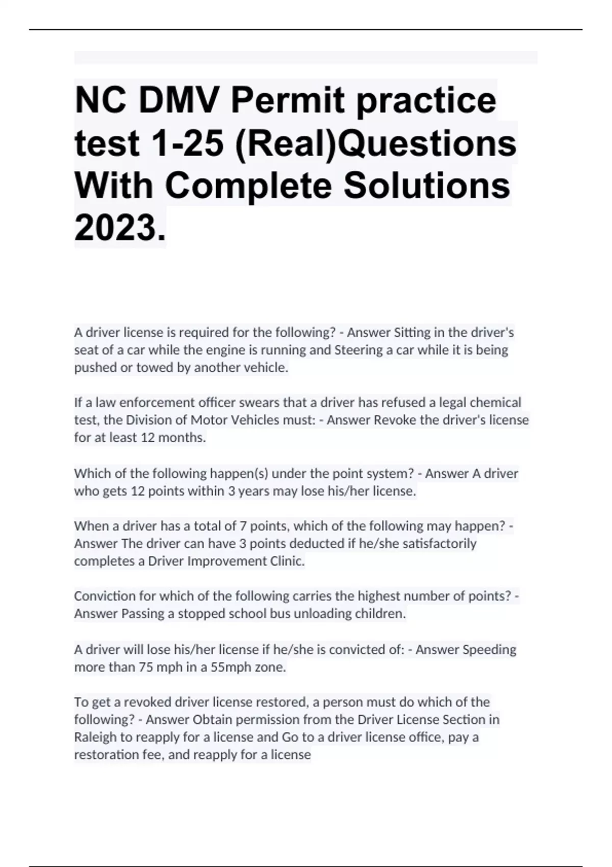 NC DMV Permit practice test 1-25 (Real)Questions With Complete Solutions 2023.