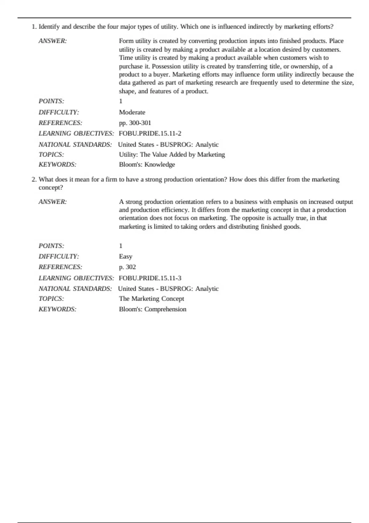 1. Identify and describe the four major types of utility. Which one is influenced indirectly by marketing efforts? ANSWER: Form utility is created by converting production inputs into finished products. Place utility is created by making a product available at a location desired by customers. Time utility is created by making a product available when customers wish to purchase it. Possession utility is created by transferring title, or ownership, of a product to a buyer. Marketing efforts may influence form utility indirectly because the data gathered as part of marketing research are frequently used to determine the size, shape, and features of a product. POINTS: 1 DIFFICULTY: Moderate REFERENCES: pp. 300-301 LEARNING OBJECTIVES: FOBU.PRIDE.15.11-2 NATIONAL STANDARDS: United States - BUSPROG: Analytic TOPICS: Utility: The Value Added by Marketing KEYWORDS: Bloom's: Knowledge 2. What does it mean for a firm to have a strong production orientation? How does this differ from the marketing concept? ANSWER: A strong production orientation refers to a business with emphasis on increased output and production efficiency. It differs from the marketing concept in that a production orientation does not focus on marketing. The opposite is actually true, in that marketing is limited to taking orders and distributing finished goods. POINTS: 1 DIFFICULTY: Easy REFERENCES: p. 302 LEARNING OBJECTIVES: FOBU.PRIDE.15.11-3 NATIONAL STANDARDS: United States - BUSPROG: Analytic TOPICS: The Marketing Concept KEYWORDS: Bloom's: Comprehension 3. Your firm would like to implement the marketing concept. What information will you need? Since the acquisition of information costs money, justify your need for this information. ANSWER: Your firm must obtain information about its present and potential customers and determine not only what customers’ needs are but also how well these needs are being satisfied by products currently in the market. You must ascertain how its products might be improved and what opinions customers have about the firm and its marketing efforts. This information is needed to pinpoint the specific needs and potential customers toward which it will direct its marketing activities and resources. This focus allows for a cost savings and potential for increased revenue in the long run. POINTS: 1 DIFFICULTY: Challenging REFERENCES: p. 303 LEARNING OBJECTIVES: FOBU.PRIDE.15.11-3 NATIONAL STANDARDS: United States - AACSB: Reflective Thinking TOPICS: The Marketing Concept KEYWORDS: Bloom's: Application 4. Why would relationship marketing be valuable to a company? Why would it be valuable to a customer? ANSWER: Relationship marketing can help a business understand customers’ needs and strive to increase value to buyers over time. From the customers’ side, trust in the company grows with relationship marketing and value in relation to the product or service grows. POINTS: 1 DIFFICULTY: Moderate REFERENCES: pp. 298-299 LEARNING OBJECTIVES: FOBU.PRIDE.15.11-3 NATIONAL STANDARDS: United States - BUSPROG: Analytic TOPICS: The Marketing Concept KEYWORDS: Bloom's: Comprehension 5. What is a market? ANSWER: A market is a group of individuals or organizations, or both, that need products or services in a given category and that have the ability, willingness, and authority to purchase such products. Markets are typically categorized as consumer markets or business-to-business markets. POINTS: 1 DIFFICULTY: Easy REFERENCES: p. 303 LEARNING OBJECTIVES: FOBU.PRIDE.15.11-5 NATIONAL STANDARDS: United States - BUSPROG: Analytic TOPICS: Markets and Their Classification KEYWORDS: Bloom's: Knowledge 6. Describe the two broad targeting approaches in business, and give an example of each. ANSWER: The undifferentiated approach is when a company designs a single marketing mix and directs it at the entire market. Staple items like salt and sugar fall in this category. The market segmentation approach is when the firm directs its attention and marketing to a particular portion, or segment, of the total market. Categorizing boats as sailboats, fishing boats, or speedboats is an example. POINTS: 1 DIFFICULTY: Moderate REFERENCES: pp. 304; 306 LEARNING OBJECTIVES: FOBU.PRIDE.15.11-5 NATIONAL STANDARDS: United States - BUSPROG: Analytic TOPICS: Developing Marketing Strategies KEYWORDS: Bloom's: Comprehension 7. What four main elements does the marketing mix contain? ANSWER: Every marketing mix contains the following: Product, which includes product design, brand name, packaging, and warranties Price, which is concerned with both base prices and discounts of various kinds Distribution, which involves not only transportation and storage but also the selection of intermediaries Promotion, which focuses on providing information to target markets POINTS: 1 DIFFICULTY: Easy REFERENCES: p. 308 LEARNING OBJECTIVES: FOBU.PRIDE.15.11-5 NATIONAL STANDARDS: United States - BUSPROG: Analytic TOPICS: Developing Marketing Strategies KEYWORDS: Bloom's: Knowledge 8. What are the major forces in the marketing environment? ANSWER: The economic forces affect economic conditions and customers’ ability and willingness to buy. Sociocultural forces are influences in a society and its culture that result in changes in beliefs and lifestyles. Political forces are the influences that arise through the actions of elected and appointed officials. Competitive forces are the actions of competitors that influence the process of implementing marketing plans. Legal and regulatory forces are the laws that protect consumers, competition, and control marketing. Technological forces are the technological changes that can create new marketing opportunities or cause products to possibly become obsolete. POINTS: 1 DIFFICULTY: Easy REFERENCES: p. 309 LEARNING OBJECTIVES: FOBU.PRIDE.15.11-6 NATIONAL STANDARDS: United States - BUSPROG: Analytic TOPICS: Marketing Strategy and the Marketing Environment KEYWORDS: Bloom's: Knowledge 9. Describe the purpose of an executi