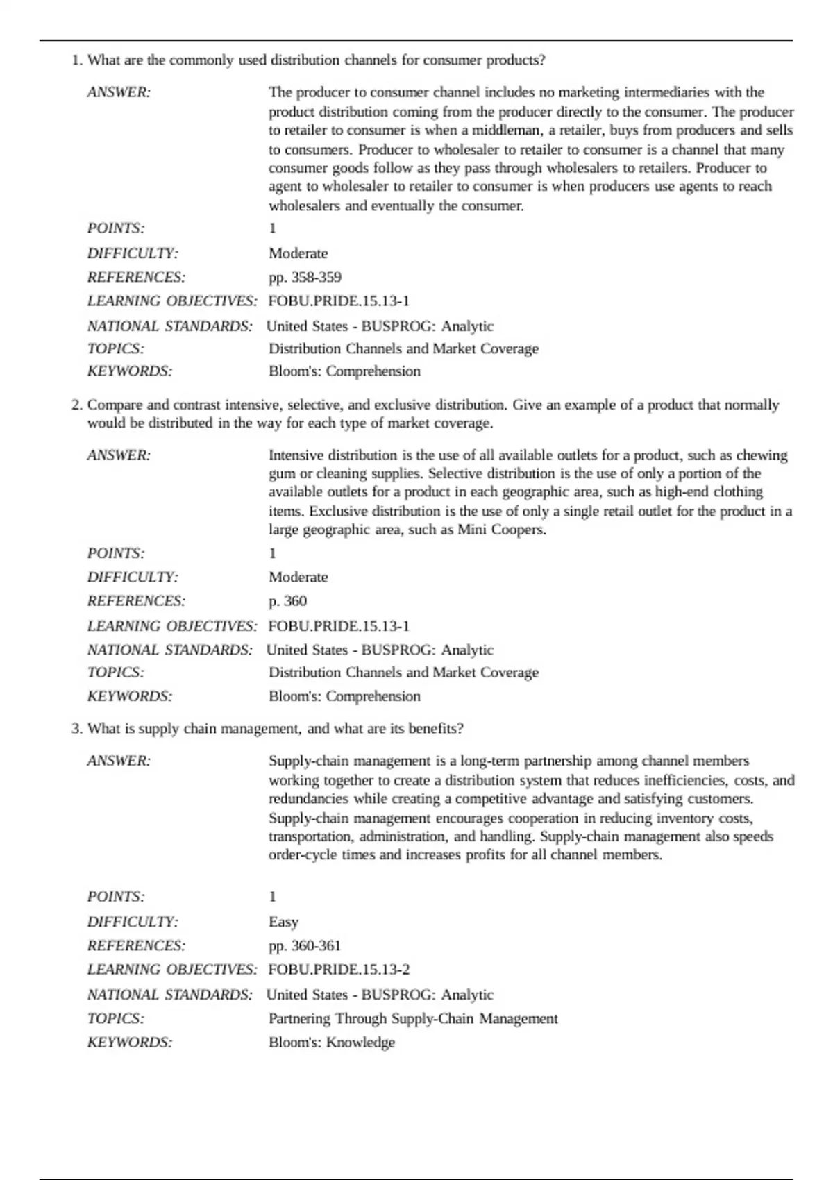 1. What are the commonly used distribution channels for consumer products? ANSWER: The producer to consumer channel includes no marketing intermediaries with the product distribution coming from the producer directly to the consumer. The producer to retailer to consumer is when a middleman, a retailer, buys from producers and sells to consumers. Producer to wholesaler to retailer to consumer is a channel that many consumer goods follow as they pass through wholesalers to retailers. Producer to agent to wholesaler to retailer to consumer is when producers use agents to reach wholesalers and eventually the consumer. POINTS: 1 DIFFICULTY: Moderate REFERENCES: pp. 358-359 LEARNING OBJECTIVES: FOBU.PRIDE.15.13-1 NATIONAL STANDARDS: United States - BUSPROG: Analytic TOPICS: Distribution Channels and Market Coverage KEYWORDS: Bloom's: Comprehension 2. Compare and contrast intensive, selective, and exclusive distribution. Give an example of a product that normally would be distributed in the way for each type of market coverage. ANSWER: Intensive distribution is the use of all available outlets for a product, such as chewing gum or cleaning supplies. Selective distribution is the use of only a portion of the available outlets for a product in each geographic area, such as high-end clothing items. Exclusive distribution is the use of only a single retail outlet for the product in a large geographic area, such as Mini Coopers. POINTS: 1 DIFFICULTY: Moderate REFERENCES: p. 360 LEARNING OBJECTIVES: FOBU.PRIDE.15.13-1 NATIONAL STANDARDS: United States - BUSPROG: Analytic TOPICS: Distribution Channels and Market Coverage KEYWORDS: Bloom's: Comprehension 3. What is supply chain management, and what are its benefits? ANSWER: Supply-chain management is a long-term partnership among channel members working together to create a distribution system that reduces inefficiencies, costs, and redundancies while creating a competitive advantage and satisfying customers. Supply-chain management encourages cooperation in reducing inventory costs, transportation, administration, and handling. Supply-chain management also speeds order-cycle times and increases profits for all channel members. POINTS: 1 DIFFICULTY: Easy REFERENCES: pp. 360-361 LEARNING OBJECTIVES: FOBU.PRIDE.15.13-2 NATIONAL STANDARDS: United States - BUSPROG: Analytic TOPICS: Partnering Through Supply-Chain Management KEYWORDS: Bloom's: Knowledge 4. How do full-service wholesalers and limited service wholesalers differ? How do general merchandise wholesalers, limited-line wholesalers, and speciality-line wholesalers differ in the products they carry? ANSWER: Fullservice wholesalers perform the entire range of wholesaler functions—delivering goods, supplying warehousing, arranging for credit, supporting promotional activities, and providing general customer assistance. This differs from a limited-service wholesaler who assumes responsibility for only a few wholesale services, not the full range. POINTS: 1 DIFFICULTY: Moderate REFERENCES: p. 362 LEARNING OBJECTIVES: FOBU.PRIDE.15.13-3 NATIONAL STANDARDS: United States - BUSPROG: Analytic TOPICS: Marketing Intermediaries: Wholesalers KEYWORDS: Bloom's: Comprehension 5. How are department stores defined? Mention several examples of department stores. ANSWER: Department stores are large retail establishments that employ 25 or more persons and sell home furnishings, appliances, family apparel, and household linens and dry goods. Macy’s, Sears, and JCPenney are all department stores. POINTS: 1 DIFFICULTY: Moderate REFERENCES: p. 363 LEARNING OBJECTIVES: FOBU.PRIDE.15.13-4 NATIONAL STANDARDS: United States - BUSPROG: Analytic TOPICS: Marketing Intermediaries: Retailers KEYWORDS: Bloom's: Comprehension 6. What is the goal of integrated marketing communications? ANSWER: The major goal of integrated marketing communications is to send a consistent message to customers. This approach fosters not only long-term customer relationships but also the efficient use of promotional resources. POINTS: 1 DIFFICULTY: Easy REFERENCES: p. 371 LEARNING OBJECTIVES: FOBU.PRIDE.15.13-6 NATIONAL STANDARDS: United States - BUSPROG: Analytic TOPICS: What is Integrated Marketing Communications? KEYWORDS: Bloom's: Knowledge 7. What is the role of promotion in the marketing mix? ANSWER: The role of promotion is to facilitate exchanges directly or indirectly by informing individuals, groups, or organizations and influencing them to accept a firm’s products or to have more positive feelings about the firm. The broader role of promotion is to maintain positive relationships between a company and various groups in the marketing environment. POINTS: 1 DIFFICULTY: Moderate REFERENCES: pp. 372-373 LEARNING OBJECTIVES: FOBU.PRIDE.15.13-7 NATIONAL STANDARDS: United States - BUSPROG: Analytic TOPICS: The Promotion Mix: An Overview KEYWORDS: Bloom's: Comprehension 8. What are the four primary elements in an organization’s promotion mix? Briefly describe each of the elements. ANSWER: The four primary elements in an organization’s promotion mix include: (1) advertising -paid nonpersonal messages communicated to a select audience through a mass medium; (2) personal selling--personal communication aimed at informing customers and persuading them to buy a firm’s products; (3) sale promotionuse of activities or materials as direct inducements to customers or salespersons; and (4) public relations- -a broad set of communication activities used to create and maintain favorable relationships between an organization and various public groups. POINTS: 1 DIFFICULTY: Moderate REFERENCES: pp. 372-373 LEARNING OBJECTIVES: FOBU.PRIDE.15.13-7 NATIONAL STANDARDS: United States - BUSPROG: Analytic TOPICS: The Promotion Mix: An Overview KEYWORDS: Bloom's: Comprehension 9. How does immediate-response advertising differ from reminder advertising? ANSWER: Immediate-response advertising is selective-demand advertising that aims at persuading consumers to ma