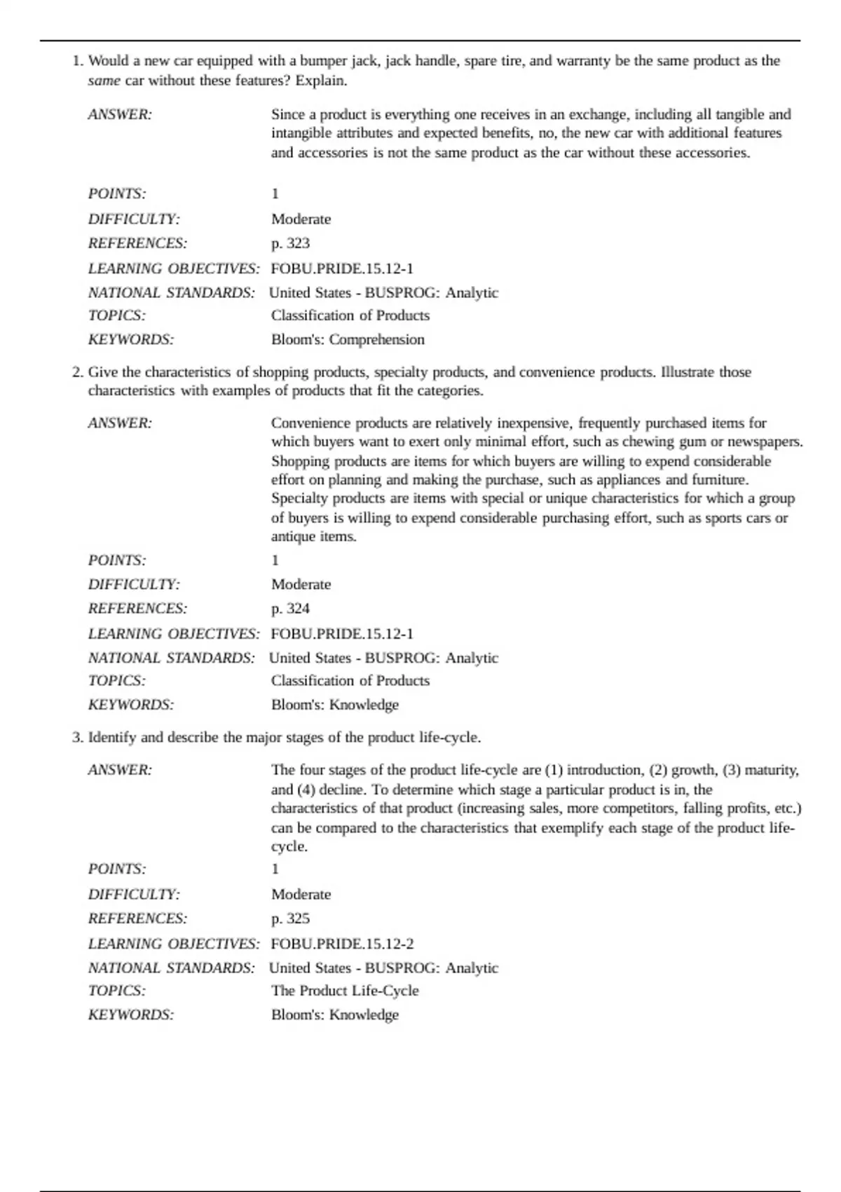 1. Would a new car equipped with a bumper jack, jack handle, spare tire, and warranty be the same product as the same car without these features? Explain. ANSWER: Since a product is everything one receives in an exchange, including all tangible and intangible attributes and expected benefits, no, the new car with additional features and accessories is not the same product as the car without these accessories. POINTS: 1 DIFFICULTY: Moderate REFERENCES: p. 323 LEARNING OBJECTIVES: FOBU.PRIDE.15.12-1 NATIONAL STANDARDS: United States - BUSPROG: Analytic TOPICS: Classification of Products KEYWORDS: Bloom's: Comprehension 2. Give the characteristics of shopping products, specialty products, and convenience products. Illustrate those characteristics with examples of products that fit the categories. ANSWER: Convenience products are relatively inexpensive, frequently purchased items for which buyers want to exert only minimal effort, such as chewing gum or newspapers. Shopping products are items for which buyers are willing to expend considerable effort on planning and making the purchase, such as appliances and furniture. Specialty products are items with special or unique characteristics for which a group of buyers is willing to expend considerable purchasing effort, such as sports cars or antique items. POINTS: 1 DIFFICULTY: Moderate REFERENCES: p. 324 LEARNING OBJECTIVES: FOBU.PRIDE.15.12-1 NATIONAL STANDARDS: United States - BUSPROG: Analytic TOPICS: Classification of Products KEYWORDS: Bloom's: Knowledge 3. Identify and describe the major stages of the product life-cycle. ANSWER: The four stages of the product life-cycle are (1) introduction, (2) growth, (3) maturity, and (4) decline. To determine which stage a particular product is in, the characteristics of that product (increasing sales, more competitors, falling profits, etc.) can be compared to the characteristics that exemplify each stage of the product lifecycle. POINTS: 1 DIFFICULTY: Moderate REFERENCES: p. 325 LEARNING OBJECTIVES: FOBU.PRIDE.15.12-2 NATIONAL STANDARDS: United States - BUSPROG: Analytic TOPICS: The Product Life-Cycle KEYWORDS: Bloom's: Knowledge 4. At what stage in the product life-cycle would sales volume tend to decrease sharply? Why? ANSWER: The decline stage of the product life-cycle is when sales volume decreases sharply and profits fall. The decline stage is the last stage of the product life-cycle. Decline often occurs due to technological advances or environmental factors or because consumers have switched to competing brands. POINTS: 1 DIFFICULTY: Moderate REFERENCES: p. 327 LEARNING OBJECTIVES: FOBU.PRIDE.15.12-2 NATIONAL STANDARDS: United States - BUSPROG: Analytic TOPICS: The Product Life-Cycle KEYWORDS: Bloom's: Comprehension 5. Are a product mix and a product line the same thing? Why or why not? ANSWER: No, a product line is a group of similar products that differ only in relatively minor characteristics. They are often products that are related in the way they are produced, marketed, or used. A product mix consists of all the products a firm offers for sale--likely with little or no relationship among them. POINTS: 1 DIFFICULTY: Moderate REFERENCES: p. 328 LEARNING OBJECTIVES: FOBU.PRIDE.15.12-3 NATIONAL STANDARDS: United States - BUSPROG: Analytic TOPICS: Product Line and Product Mix KEYWORDS: Bloom's: Comprehension 6. Identify and discuss the three major ways that a product mix can be improved. ANSWER: One way of improving a product mix of a company is through product modification, the changing of one or more of a product’s characteristics. The products need to be modifiable, the change needs to be perceived by consumers, and the modification needs to fit with customers’ needs and wants. A second way of improving a product mix is line extension, the development of a product closely related to one or more products in the existing product line. POINTS: 1 DIFFICULTY: Challenging REFERENCES: pp. 329-330 LEARNING OBJECTIVES: FOBU.PRIDE.15.12-4 NATIONAL STANDARDS: United States - BUSPROG: Analytic TOPICS: Managing the Product Mix KEYWORDS: Bloom's: Comprehension KEYWORDS: Bloom's: Comprehension 7. What are the major phases involved in the new product development process? ANSWER: The phases of new-product development start with idea generation, followed by screening, concept testing, business analysis, product development, test marketing, and commercialization. POINTS: 1 DIFFICULTY: Moderate REFERENCES: p. 331 LEARNING OBJECTIVES: FOBU.PRIDE.15.12-4 NATIONAL STANDARDS: United States - BUSPROG: Analytic TOPICS: Managing the Product Mix KEYWORDS: Bloom's: Knowledge 8. Developing new products is risky, time consuming, and expensive with a high rate of failure. Nevertheless, “failing to introduce new products can be just as hazardous.” What is meant by this quote? ANSWER: Answers will vary. If a company and their products or services become stale, competitors will take over that market; that is a risk unto itself. Despite the risk of devoting resources to new product development, successful new products bring a number of benefits: survival of the firm, profits, a sustainable competitive advantage, and a favorable image. POINTS: 1 DIFFICULTY: Moderate REFERENCES: p. 330 LEARNING OBJECTIVES: FOBU.PRIDE.15.12-4 NATIONAL STANDARDS: United States - BUSPROG: Analytic TOPICS: Managing the Product Mix KEYWORDS: Bloom's: Comprehension 9. Is McDonald's "golden arches" symbol a brand name or a brand mark? Define each term, and state how they differ. ANSWER: McDonald’s golden arches are a brand mark, a part of a brand that is a symbol or distinctive design. A brand name, on the other hand, is the part of a brand that can be spokenwhich, of course, McDonald’s arches cannot. POINTS: 1 DIFFICULTY: Challenging REFERENCES: p. 333 LEARNING OBJECTIVES: FOBU.PRIDE.15.12-5 NATIONAL STANDARDS: United States - BUSPROG: Analytic KEYWORDS: Bloom's: Comprehension TOPICS: Branding, Packaging, and Labeling