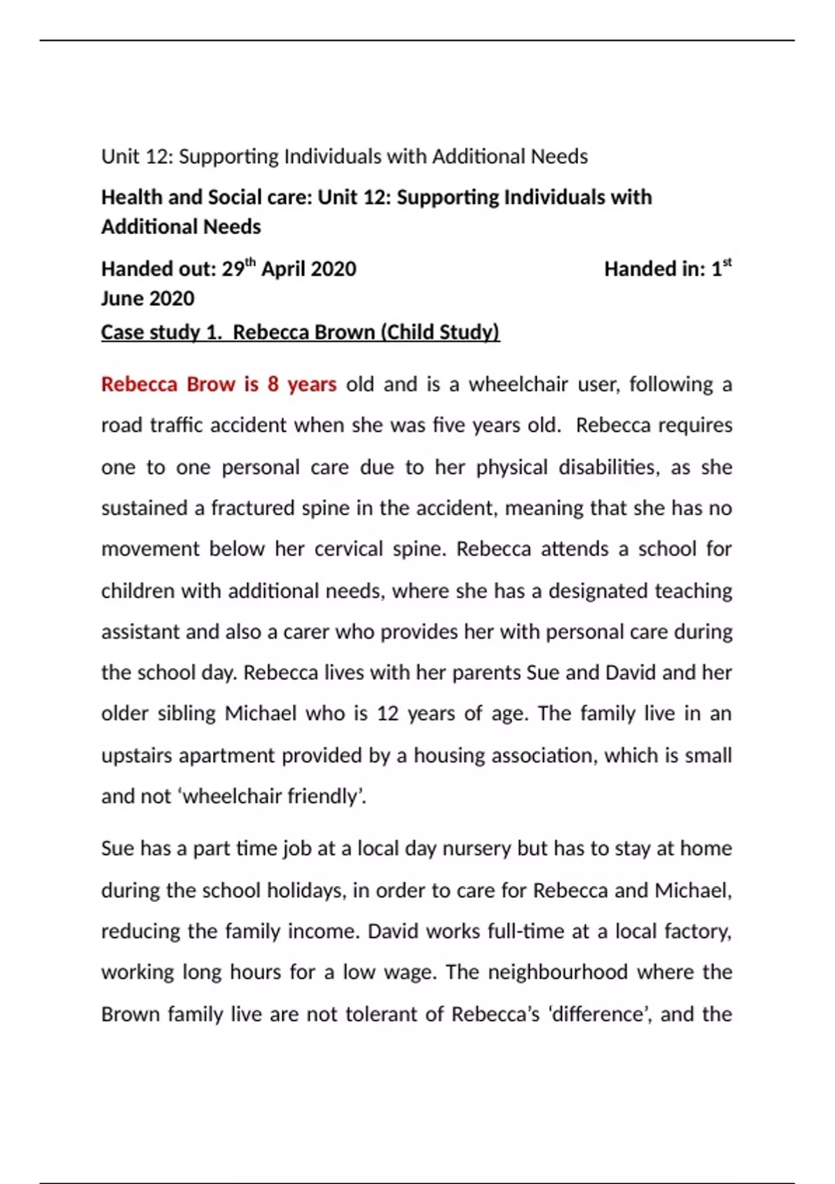 Unit 12: Supporting Individuals with Additional Needs Health and Social care: Unit 12: Supporting Individuals with Additional Needs Handed out: 29th April 2020 Handed in: 1st June 2020 Case study 1. Rebecca Brown (Child Study) Rebecca Brow is 8 years old and is a wheelchair user, following a road traffic accident when she was five years old. Rebecca requires one to one personal care due to her physical disabilities, as she sustained a fractured spine in the accident, meaning that she has no movement below her cervical spine. Rebecca attends a school for children with additional needs, where she has a designated teaching assistant and also a carer who provides her with personal care during the school day. Rebecca lives with her parents Sue and David and her older sibling Michael who is 12 years of age. The family live in an upstairs apartment provided by a housing association, which is small and not ‘wheelchair friendly’. Learning Aim A: Examine reasons why individuals may experience additional Needs A1 Diagnosing or determining additional needs A.P1 Explain diagnostic procedures to determine additional needs for one child and one adult with different additional needs. • What are the diagnostic procedures, tools and standards used to diagnose a disability example Downs Syndrome and diabetes. (P1) • What professional background, qualifications and experience required of those undertaking the diagnosis and assessment.