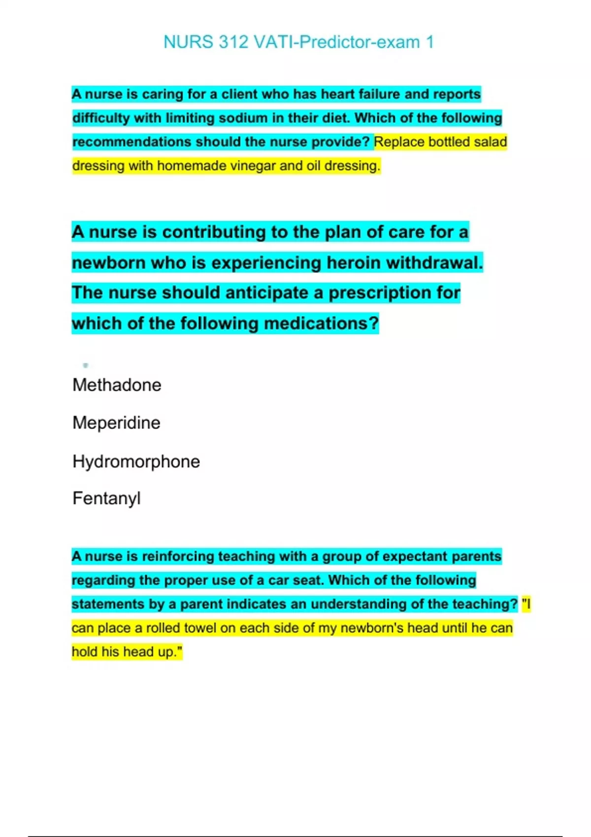 A nurse is caring for a client who has heart failure and reports difficulty with limiting sodium in their diet. Which of the following recommendations should the nurse provide? Replace bottled salad dressing with homemade vinegar and oil dressing. A nurse is contributing to the plan of care for a newborn who is experiencing heroin withdrawal. The nurse should anticipate a prescription for which of the following medications? Methadone Meperidine Hydromorphone Fentanyl A nurse is reinforcing teaching with a group of expectant parents regarding the proper use of a car seat. Which of the following statements by a parent indicates an understanding of the teaching? "I can place a rolled towel on each side of my newborn's head until he can hold his head up." A nurse is contributing to the discharge plans for four clients. The nurse should identify that which of the following clients requires an interdisciplinary care conference? A client who has hemiparesis and lives alone A nurse is reinforcing discharge teaching with a client who has type 1 diabetes mellitus. Which of the following client statements indicates an understanding of the teaching? "I will dispose of insulin needles in a puncture-proof container." "I will store opened insulin vials in my refrigerator." "I will shake the insulin vial before drawing it into the syringe." "I will expect my regular insulin to appear cloudy." A nurse is planning to reinforce teaching with a preschooler who is about to undergo an incision and drainage for cellulitis on the left arm. Which of the following techniques should the nurse use? Take the child on a tour of the surgery and recovery areas. A nurse in a pediatric clinic is reviewing the urine laboratory results for an adolescent. For which of the following results should the nurse notify the provider?Ketones positive A nurse is visiting with the family of a client who has just died. Which of the following actions should the nurse take to promote comfort for the family? Allow the family as much time as they want with the client. A nurse on a maternal newborn unit is assisting with the preparation of an in-service presentation about infection control. Which of the following information should the nurse recommend to include?Visitors who have an upper respiratory infection should wear a mask. A nurse is collecting data from a client who is postoperative and received hydromorphone 4 mg PO 15 min ago. The client tells the nurse, "My pain level is still 8 on a 0 to 10 scale." Which of the following actions should the nurse take first? Reevaluate the client's response to the medication in 30 min. A nurse in a provider's office is reinforcing teaching with the parents of a school-age child who has an active case of Pediculosis humanus capitis. Which of the following should the nurse include in the teaching? Wash the bed linens in hot water. A nurse from a medical-surgical unit is floating to a postpartum unit. Which of the following clients is an appropriate assignment for the nurse to accept? A client who had a cesarean delivery 24 hr ago A nurse is assisting with the care of a client who is in active labor. Which of the following data is the priority for the nurse to collect following an amniotomy?Fetal heart rate A nurse is assisting in the preparation of an in-service for a group of unit nurses about ethical principles. Which of the following nursing actions should the nurse include as an example of fidelity? A nurse keeps a promise made to a client. A nurse is contributing to the plan of care for a 12-month-old infant following cleft palate repair. Which of the following actions should the nurse include? Maintain elbow restraints on the infant. A nurse administered an IM injection to a client. Which of the following actions should the nurse take to reduce the risk of a needlestick injury? Dispose of the used needle immediately in a sharps container. A nurse is collecting data from a client who has hepatitis A. Which of the following findings should the nurse expectAbdominal pain A nurse is reinforcing teaching with a client about caring for a new colostomy. Which of the following statements should the nurse make? "You should empty the colostomy bag when it is three-fourths full."