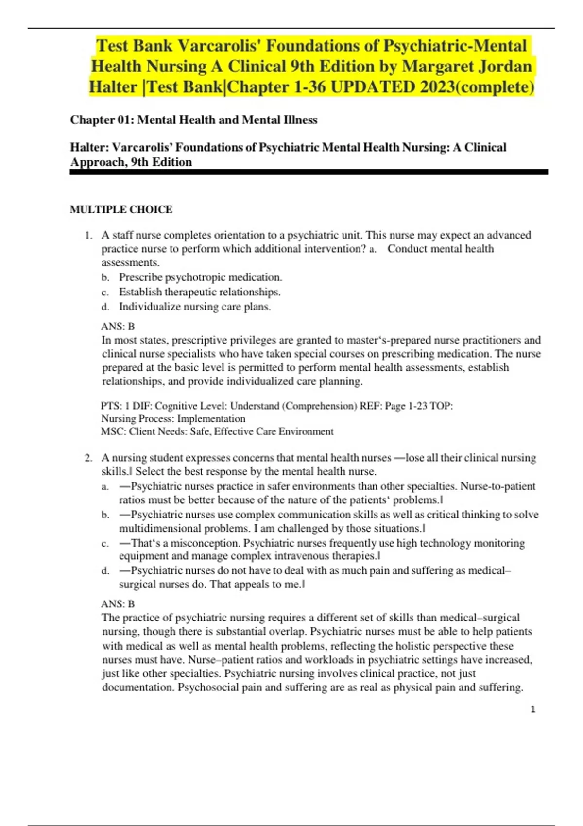 , Test Bank Varcarolis' Foundations of Psychiatric-Mental
