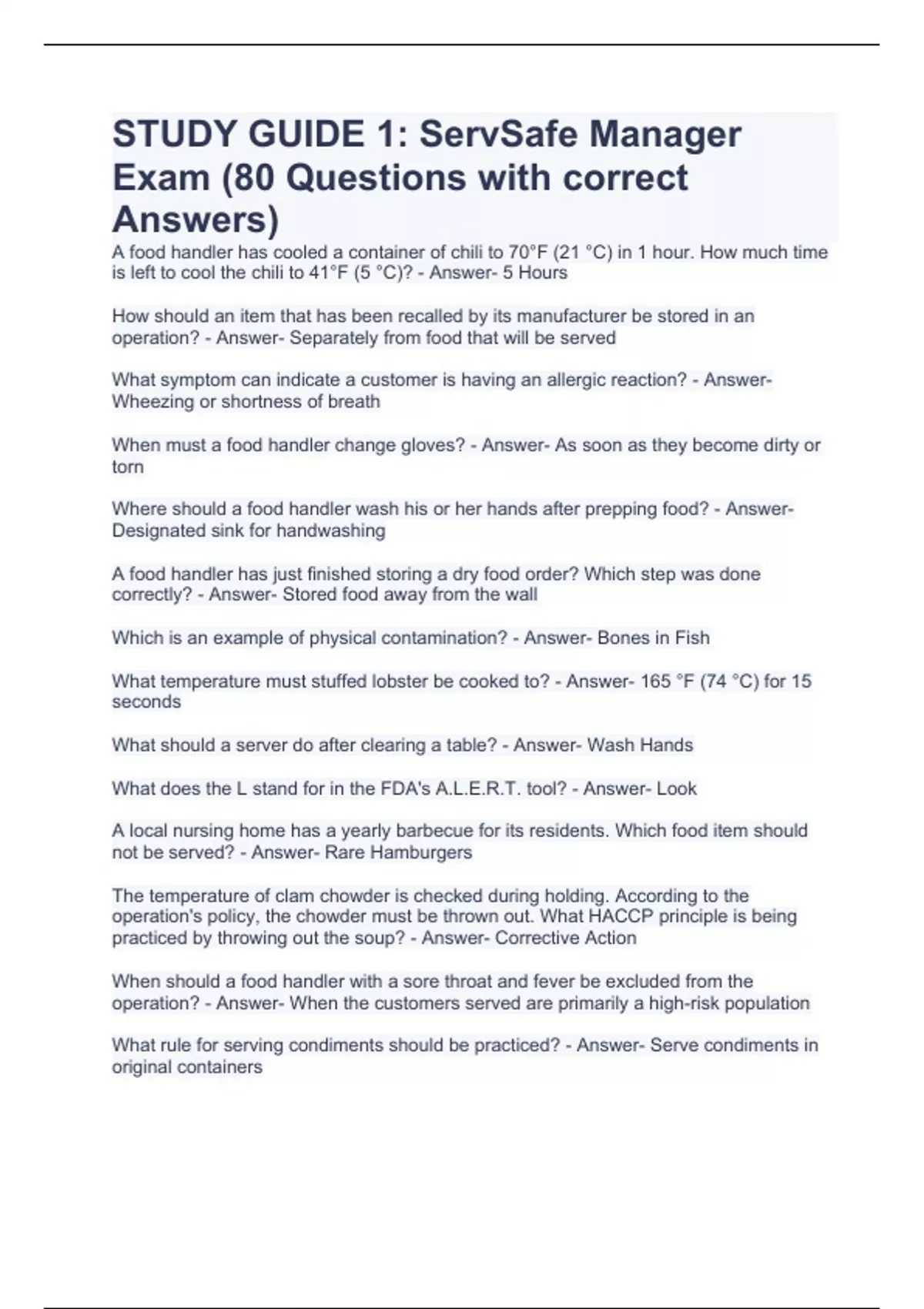 STUDY GUIDE 1: ServSafe Manager Exam (80 Questions with correct Answers)