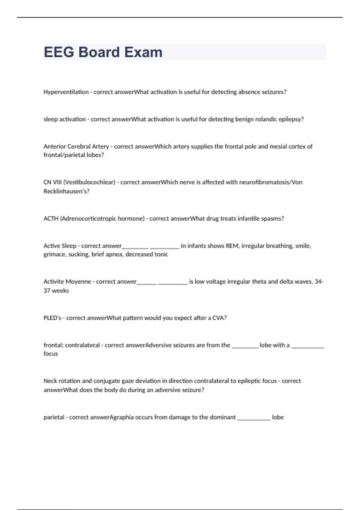 Hyperventilation What activation is useful for detecting absence seizures? sleep activation What activation is useful for detecting benign rolandic epilepsy? Anterior Cerebral Artery Which artery supplies the frontal pole and mesial cortex of frontal/parietal lobes? CN VIII (Vestibulocochlear) Which nerve is affected with neurofibromatosis/Von Recklinhausen's? ACTH (Adrenocorticotropic hormone) What drug treats infantile spasms? Active Sleep ________ _________ in infants shows REM, irregular breathing, smile, grimace, sucking, brief apnea, decreased tonic Activite Moyenne ______ _________ is low voltage irregular theta and delta waves, 34-37 weeks PLED's What pattern would you expect after a CVA? frontal; contralateral Adversive seizures are from the ________ lobe with a __________ focus