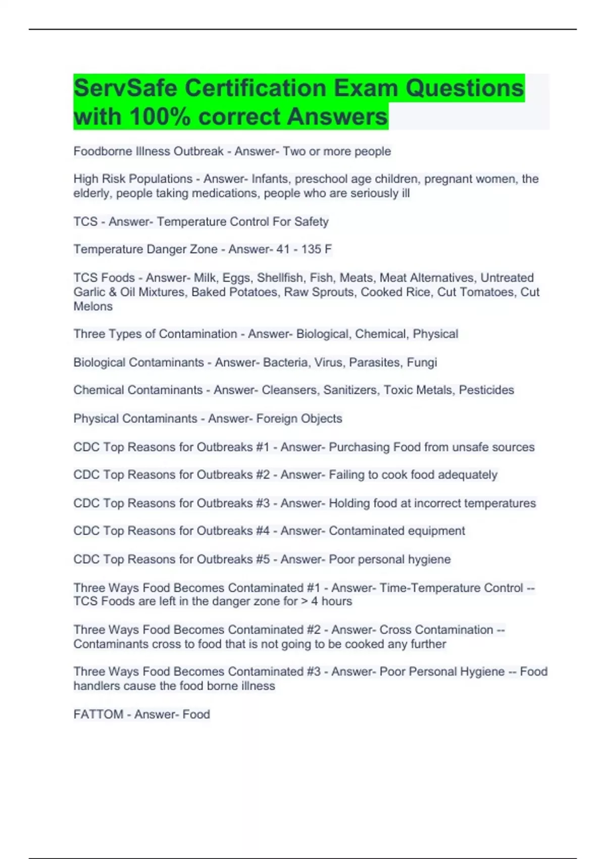 ServSafe Certification Exam Questions with 100% correct Answers