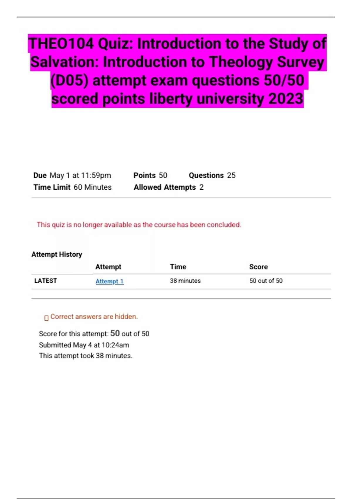 THEO104 Quiz: Introduction to the Study of Salvation: Introduction to Theology Survey (D05) attempt exam questions 50/50 scored points liberty university 2023