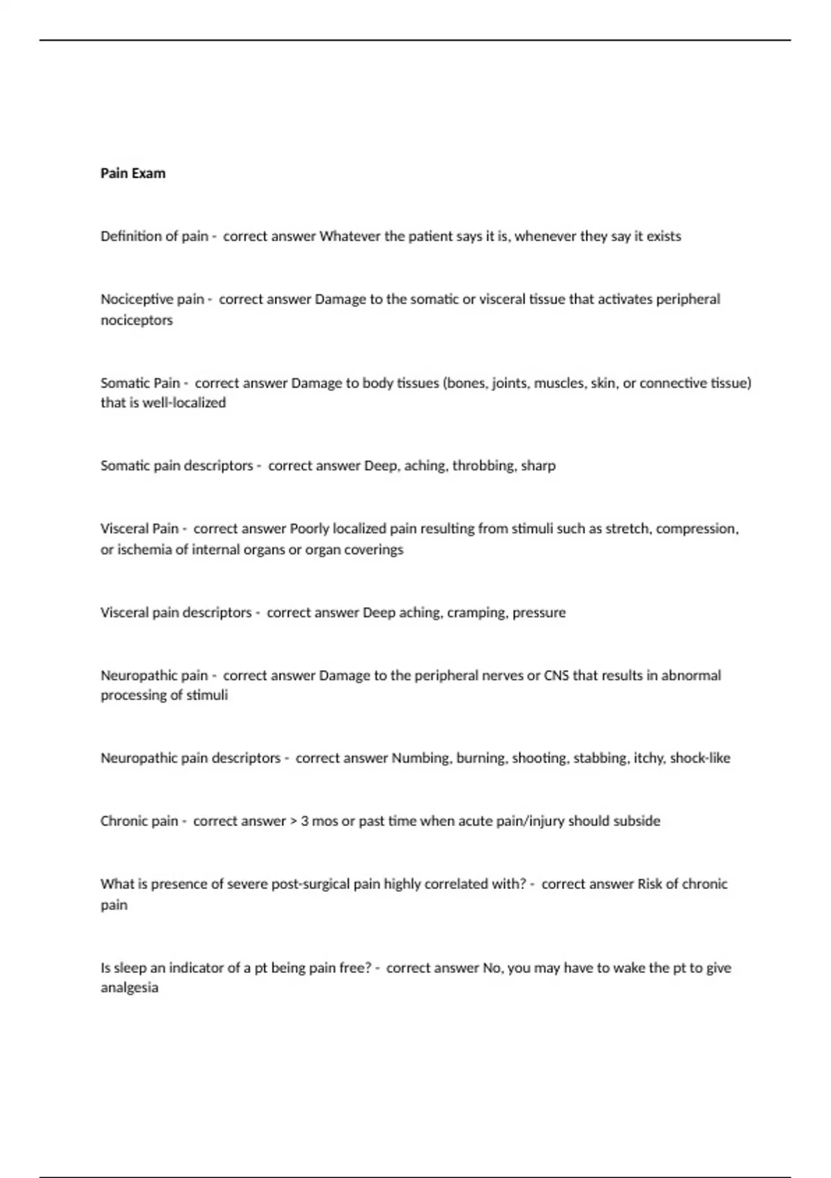 Definition of pain - correct answer Whatever the patient says it is, whenever they say it exists Nociceptive pain - correct answer Damage to the somatic or visceral tissue that activates peripheral nociceptors Somatic Pain - correct answer Damage to body tissues (bones, joints, muscles, skin, or connective tissue) that is well-localized Somatic pain descriptors - correct answer Deep, aching, throbbing, sharp Visceral Pain - correct answer Poorly localized pain resulting from stimuli such as stretch, compression, or ischemia of internal organs or organ coverings Visceral pain descriptors - correct answer Deep aching, cramping, pressure Neuropathic pain - correct answer Damage to the peripheral nerves or CNS that results in abnormal processing of stimuli Neuropathic pain descriptors - correct answer Numbing, burning, shooting, stabbing, itchy, shock-like Chronic pain - correct answer > 3 mos or past time when acute pain/injury should subside What is presence of severe post-surgical pain highly correlated with? - correct answer Risk of chronic pain Is sleep an indicator of a pt being pain free? - correct answer No, you may have to wake the pt to give analgesia