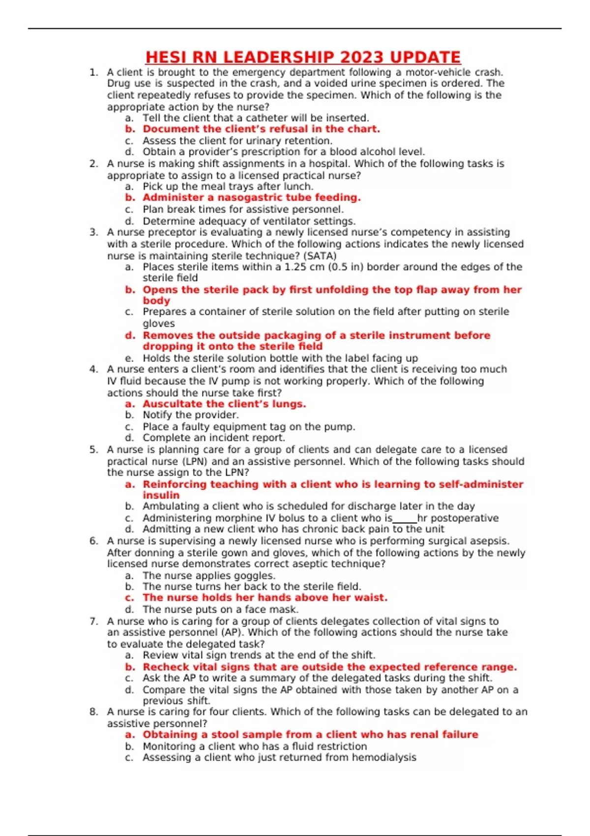 HESI RN LEADERSHIP 2023 UPDATE 1. A client is brought to the emergency department following a motor-vehicle crash. Drug use is suspected in the crash, and a voided urine specimen is ordered. The client repeatedly refuses to provide the specimen. Which of the following is the appropriate action by the nurse? a. Tell the client that a catheter will be inserted. b. Document the client’s refusal in the chart. c. Assess the client for urinary retention. d. Obtain a provider’s prescription for a blood alcohol level. 2. A nurse is making shift assignments in a hospital. Which of the following tasks is appropriate to assign to a licensed practical nurse? a. Pick up the meal trays after lunch. b. Administer a nasogastric tube feeding. c. Plan break times for assistive personnel. d. Determine adequacy of ventilator settings. 3. A nurse preceptor is evaluating a newly licensed nurse’s competency in assisting with a sterile procedure. Which of the following actions indicates the newly licensed nurse is maintaining sterile technique? (SATA) a. Places sterile items within a 1.25 cm (0.5 in) border around the edges of the sterile field b. Opens the sterile pack by first unfolding the top flap away from her body c. Prepares a container of sterile solution on the field after putting on sterile gloves d. Removes the outside packaging of a sterile instrument before dropping it onto the sterile field e. Holds the sterile solution bottle with the label facing up 4. A nurse enters a client’s room and identifies that the client is receiving too much IV fluid because the IV pump is not working properly. Which of the following actions should the nurse take first? a. Auscultate the client’s lungs. b. Notify the provider. c. Place a faulty equipment tag on the pump. d. Complete an incident report. 5. A nurse is planning care for a group of clients and can delegate care to a licensed practical nurse (LPN) and an assistive personnel. Which of the following tasks should the nurse assign to the LPN? a. Reinforcing teaching with a client who is learning to self-administer insulin b. Ambulating a client who is scheduled for discharge later in the day c. Administering morphine IV bolus to a client who is hr postoperative d. Admitting a new client who has chronic back pain to the unit 6. A nurse is supervising a newly licensed nurse who is performing surgical asepsis. After donning a sterile gown and gloves, which of the following actions by the newly licensed nurse demonstrates correct aseptic technique? a. The nurse applies goggles. b. The nurse turns her back to the sterile field. c. The nurse holds her hands above her waist. d. The nurse puts on a face mask. 7. A nurse who is caring for a group of clients delegates collection of vital signs to an assistive personnel (AP). Which of the following actions should the nurse take to evaluate the delegated task? a. Review vital sign trends at the end of the shift. b. Recheck vital signs that are outside the expected reference range. c. Ask the AP to write a summary of the delegated tasks during the shift. d. Compare the vital signs the AP obtained with those taken by another AP on a previous shift. 8. A nurse is caring for four clients. Which of the following tasks can be delegated to an assistive personnel? a. Obtaining a stool sample from a client who has renal failure b. Monitoring a client who has a fluid restriction c. Assessing a client who just returned from hemodialysis d. Reviewing dietary instructions for a client who has kidney stones 9. A nurse is triaging a group of clients following a disaster. Which of the following clients should the nurse recommend for treatment first? a. A client who has a neck injury and is unable to breathe spontaneously b. A client who has two open chest wounds with a left tracheal deviation c. A client who has major burns over 75% of her body surface area d. A client who has bipolar disorder and is exhibiting signs of hallucination (Class 3) 10. A nurse manager is reviewing guidelines for informed consent with the nursing staff. Which of the following statements by a staff nurse indicates that the teaching was effective? a. “A family member can interpret to obtain informed consent from a client who is deaf.” b. “Consent can be given by a durable power of attorney.” c. “Guardian consent is required for an emancipated minor.” d. “The nurse can answer any questions the client has about the procedure.” 11. A nurse is caring for four clients. For which of the following clients should the nurse collaborate with the facility ethics committee? a. A middle adult client who leaves the facility against medical advice b. An older adult client who has advanced directives on file c. A young adult client who is participating in a medical research study d. An adolescent client whose parents refuse a blood transfusion for religious reasons 12. A nurse in an ambulatory care setting is orient a newly licensed nurse who is preparing to return a call to a client. The nurse should explain that which of the following is an objective of telehealth? a. Assessing client needs b. Developing client treatment protocols c. Providing medication reconciliation d. Establishing communication between providers (Community Health pg. 75) 13. A nurse is providing discharge teaching to a client who has a new diagnosis of diabetes. The client expresses concern about the cost of blood-glucose monitoring supplies. Which of the following actions should the nurse take? a. Refer the client to the social services department. b. Provide the client with a week’s worth of supplies from the hospital (still needs help paying after) c. Ask the provider about the possibility of less frequent monitoring (pt needs to monitor often) d. Recommend the client reuse the testing lancets (breaks the safety & infection protocol) 14. A charge nurse is receiving change-of-shift report. Which of the following situations should the charge nurse address first? a. A nurse on t
