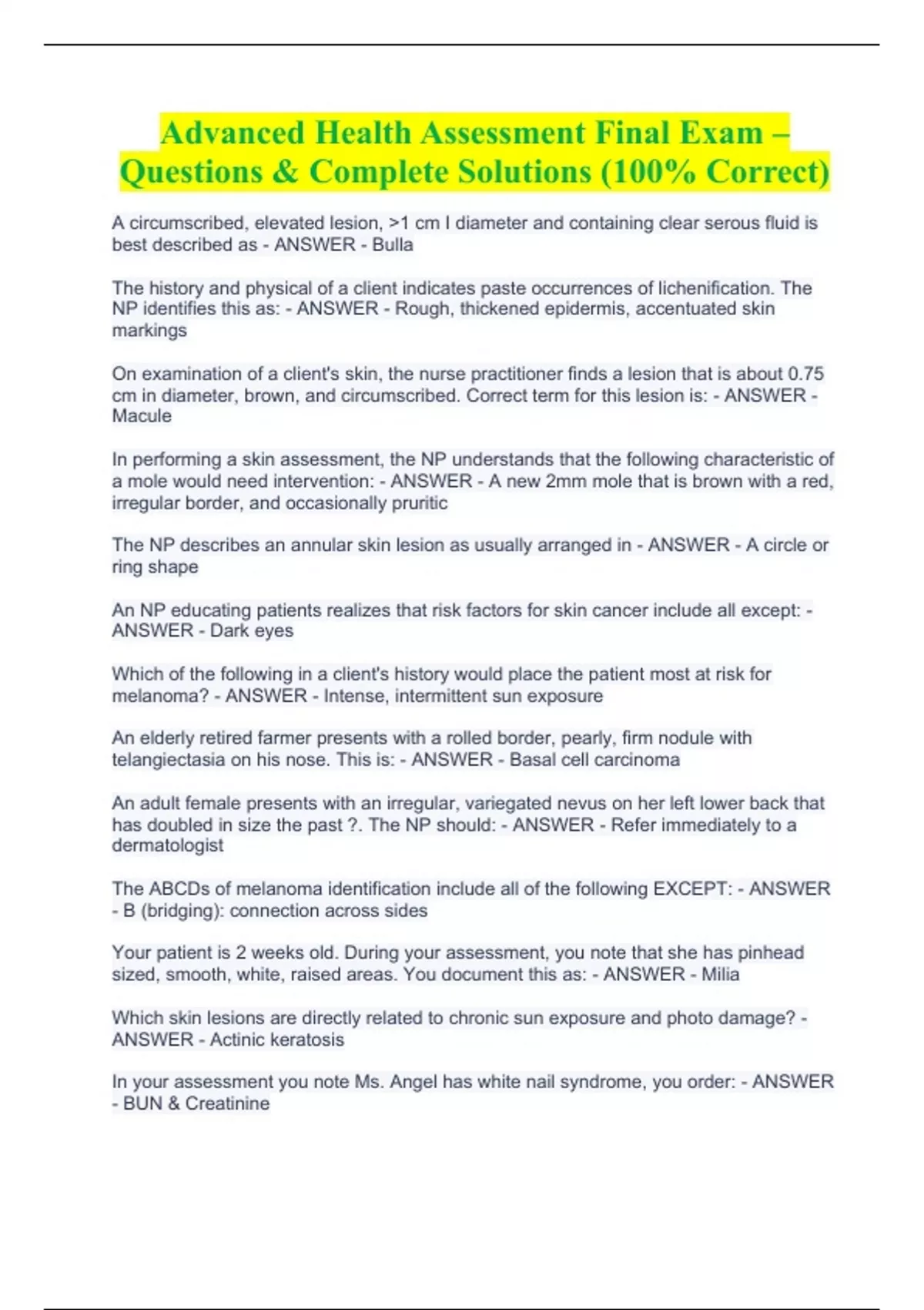 Advanced Health Assessment Final Exam – Questions & Complete Solutions (100% Correct) Advanced Health Assessment Final Exam – Questions & Complete Solutions (100% Correct) A circumscribed, elevated lesion, >1 cm I diameter and containing clear serous fluid is best described as - ANSWER - Bulla The history and physical of a client indicates paste occurrences of lichenification. The NP identifies this as: - ANSWER - Rough, thickened epidermis, accentuated skin markings On examination of a client's skin, the nurse practitioner finds a lesion that is about 0.75 cm in diameter, brown, and circumscribed. Correct term for this lesion is: - ANSWER - Macule In performing a skin assessment, the NP understands that the following characteristic of a mole would need intervention: - ANSWER - A new 2mm mole that is brown with a red, irregular border, and occasionally pruritic The NP describes an annular skin lesion as usually arranged in - ANSWER - A circle or ring shape An NP educating patients realizes that risk factors for skin cancer include all except: - ANSWER - Dark eyes Which of the following in a client's history would place the patient most at risk for melanoma? - ANSWER - Intense, intermittent sun exposure An elderly retired farmer presents with a rolled border, pearly, firm nodule with telangiectasia on his nose. This is: - ANSWER - Basal cell carcinoma An adult female presents with an irregular, variegated nevus on her left lower back that has doubled in size the past ?. The NP should: - ANSWER - Refer immediately to a dermatologist The ABCDs of melanoma identification include all of the following EXCEPT: - ANSWER - B (bridging): connection across sides Your patient is 2 weeks old. During your assessment, you note that she has pinhead sized, smooth, white, raised areas. You document this as: - ANSWER - Milia Which skin lesions are directly related to chronic sun exposure and photo damage? - ANSWER - Actinic keratosis In your assessment you note Ms. Angel has white nail syndrome, you order: - ANSWER - BUN & Creatinine