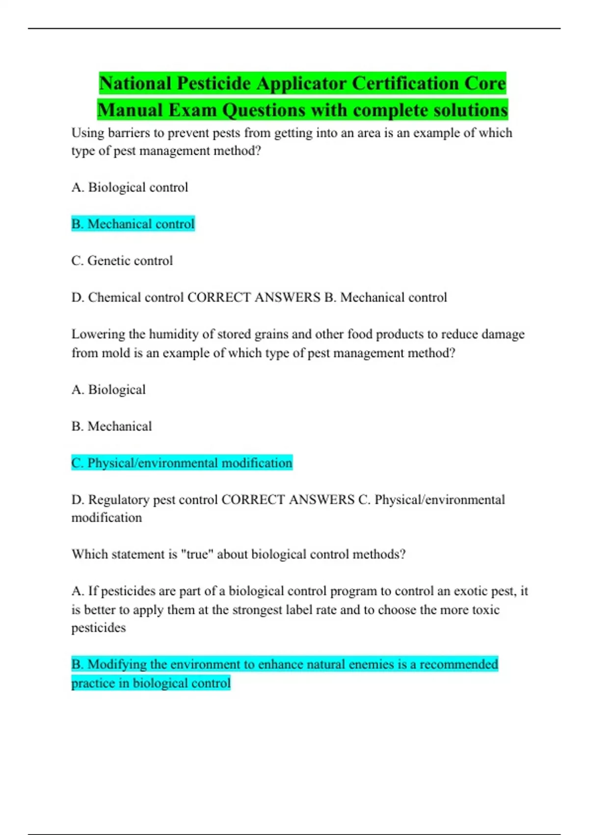 National Pesticide Applicator Certification Core Manual Exam Questions with complete solutions Using barriers to prevent pests from getting into an area is an example of which type of pest management method? Lowering the humidity of stored grains and other food products to reduce damage from mold is an example of which type of pest management method? Which statement is "true" about biological control methods? rol Sealing cracks and crevices and small openings in buildings is an example of which type of mechanical control method? Which statement is "true" about cultural control practices? Which statement is "true" about regulatory pest control? Which statement is "true" about pest management strategies in IPM? Which would be considered a preventive pest management strategy?