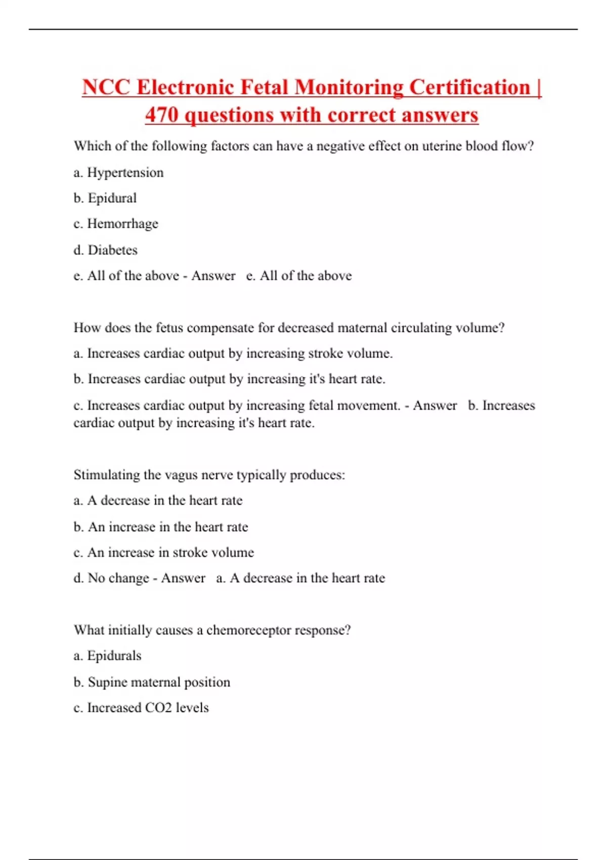Which of the following factors can have a negative effect on uterine blood flow? a. Hypertension b. Epidural c. Hemorrhage d. Diabetes e. All of the above - Answer e. All of the above How does the fetus compensate for decreased maternal circulating volume? a. Increases cardiac output by increasing stroke volume. b. Increases cardiac output by increasing it's heart rate. c. Increases cardiac output by increasing fetal movement. - Answer b. Increases cardiac output by increasing it's heart rate. Stimulating the vagus nerve typically produces: a. A decrease in the heart rate b. An increase in the heart rate c. An increase in stroke volume d. No change - Answer a. A decrease in the heart rate What initially causes a chemoreceptor response? a. Epidurals b. Supine maternal position c. Increased CO2 levels
