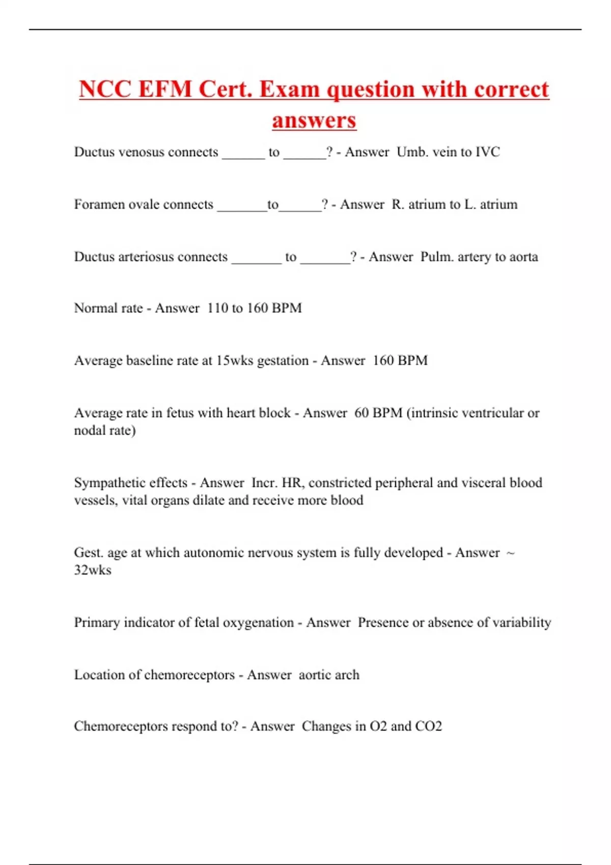 Ductus venosus connects ______ to ______? - Answer Umb. vein to IVC Foramen ovale connects _______to______? - Answer R. atrium to L. atrium Ductus arteriosus connects _______ to _______? - Answer Pulm. artery to aorta Normal rate - Answer 110 to 160 BPM Average baseline rate at 15wks gestation - Answer 160 BPM Average rate in fetus with heart block - Answer 60 BPM (intrinsic ventricular or nodal rate) Sympathetic effects - Answer Incr. HR, constricted peripheral and visceral blood vessels, vital organs dilate and receive more blood Gest. age at which autonomic nervous system is fully developed - Answer ~ 32wks Primary indicator of fetal oxygenation - Answer Presence or absence of variability Location of chemoreceptors - Answer aortic arch Chemoreceptors respond to? - Answer Changes in O2