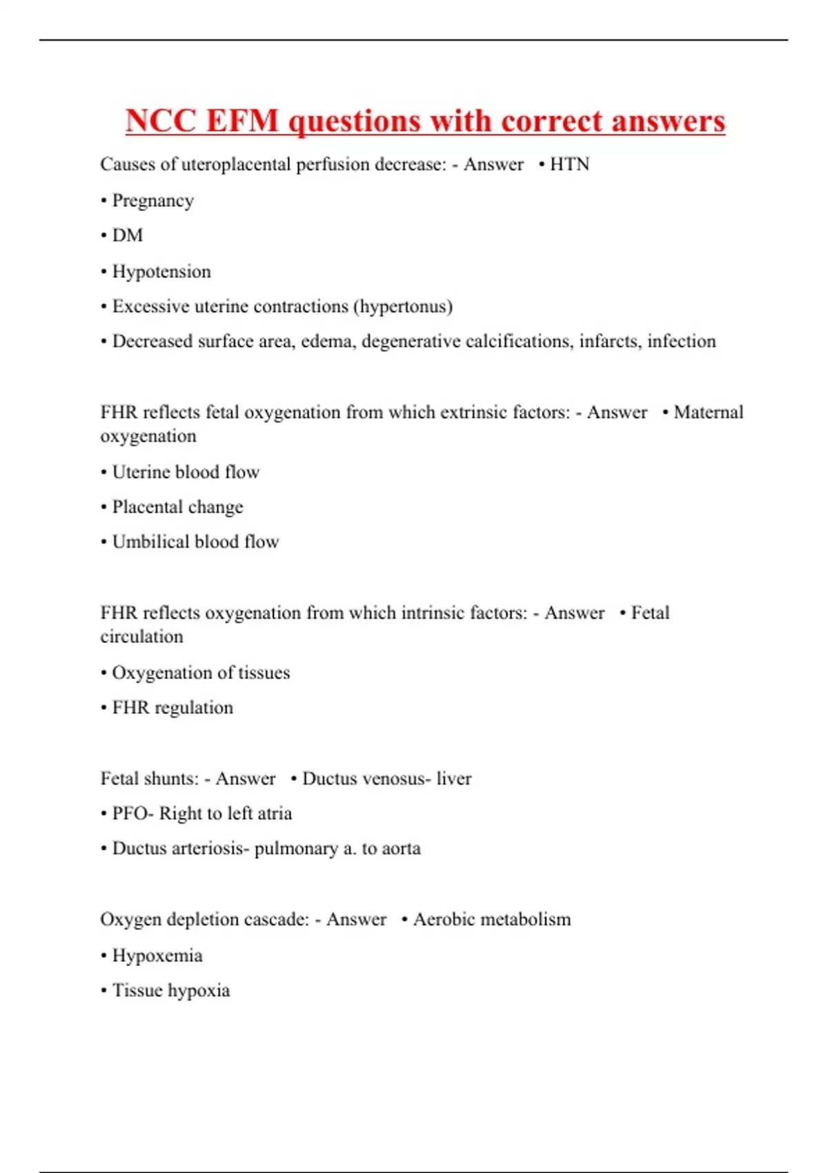 Causes of uteroplacental perfusion decrease: - Answer • HTN • Pregnancy • DM • Hypotension • Excessive uterine contractions (hypertonus) • Decreased surface area, edema, degenerative calcifications, infarcts, infection FHR reflects fetal oxygenation from which extrinsic factors: - Answer • Maternal oxygenation • Uterine blood flow • Placental change • Umbilical blood flow FHR reflects oxygenation from which intrinsic factors: - Answer • Fetal circulation • Oxygenation of tissues • FHR regulation Fetal shunts: - Answer • Ductus venosus- liver • PFO- Right to left atria