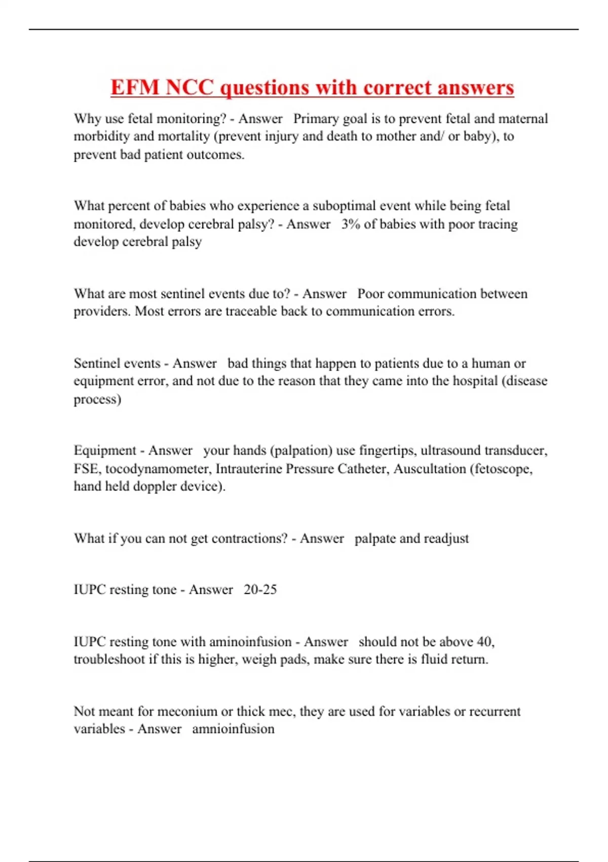 Why use fetal monitoring? - Answer Primary goal is to prevent fetal and maternal morbidity and mortality (prevent injury and death to mother and/ or baby), to prevent bad patient outcomes. What percent of babies who experience a suboptimal event while being fetal monitored, develop cerebral palsy? - Answer 3% of babies with poor tracing develop cerebral palsy What are most sentinel events due to? - Answer Poor communication between providers. Most errors are traceable back to communication errors. Sentinel events - Answer bad things that happen to patients due to a human or equipment error, and not due to the reason that they came into the hospital (disease process) Equipment - Answer your hands (palpation) use fingertips, ultrasound transducer, FSE, tocodynamometer, Intrauterine Pressure Catheter, Auscultation (fetoscope, hand held doppler device). What if you can not get contractions? - Answer palpate and readjust IUPC resting tone - Answer 20-25 IUPC resting tone with aminoinfusion - Answer should not be above 40, troubleshoot if this is higher, weigh pads, make su