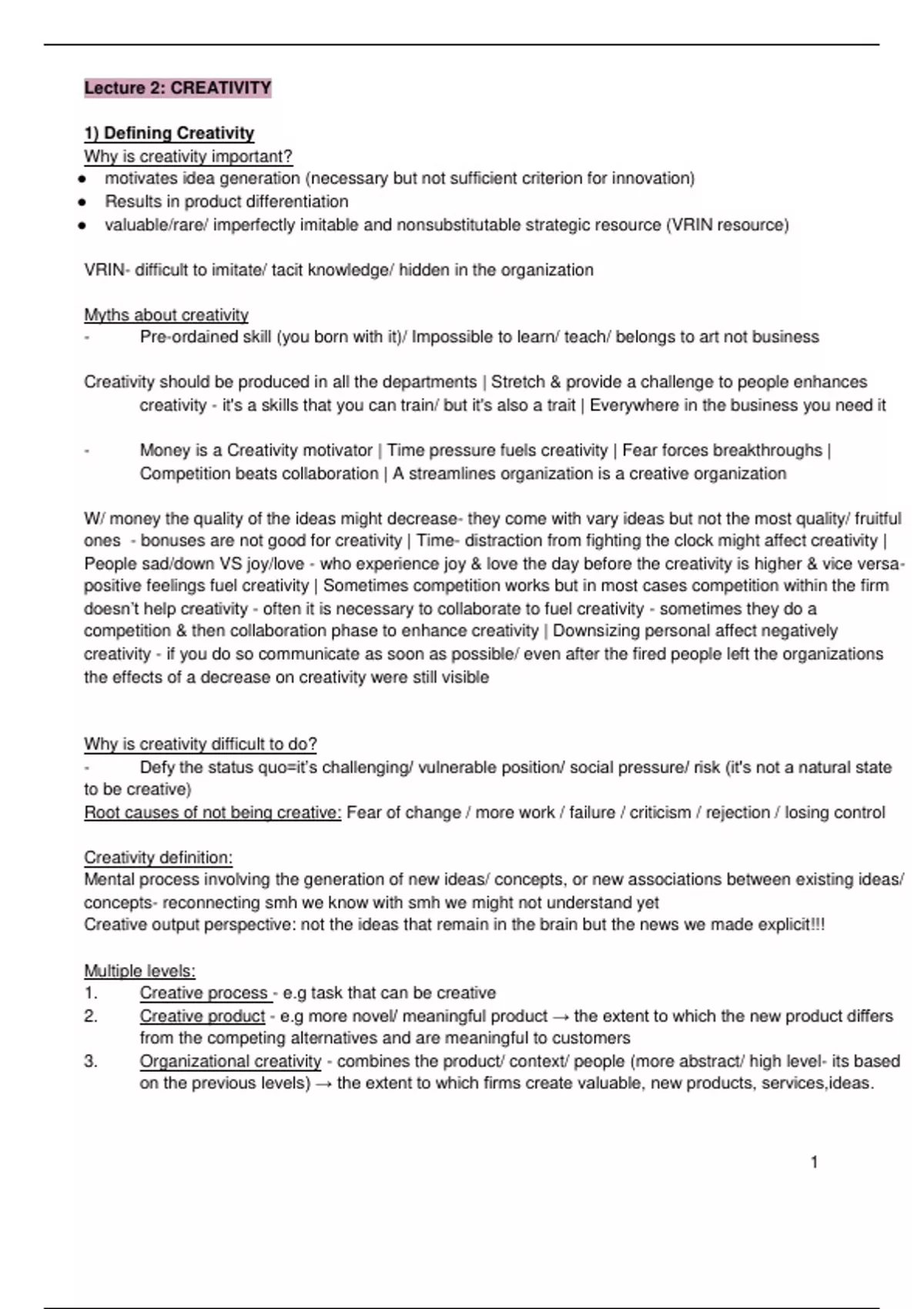 Summaries of Articles and Lectures, , 44 pages - Pisano, G. (2015) You Need an Innovation Strategy. Harvard Business Review, 46 (June): 44-54. - Zollo, M., Minoja, M., & Coda, V. (2018) Toward an Integrated Theory of Strategy. Strategic Management Journal, 39(6): . - Gong, Y., Kim, T-Y., Lee, D-R., and Zhu, J. (2013) A Multilevel Model of Team Goal Orientation, Information Exchange, and Creativity. Academy of Management Journal, 56 (3): 827–851. - Herrmann, D. and Felfe, J. (2014) Effects of Leadership Style, Creativity Technique and Personal Initiative on Employee Creativity. British Journal of Management, 25: 209–227 - Perry-Smith, J. E. and Mannucci, P. V. (2017) From Creativity to Innovation: The Social Network Drivers of the Four Phases of the Idea Journey. Academy of Management Review, 42 (1): 53–79. - Foss, N.J. (1997) On the Rationales of Corporate Headquarters. Industrial and Corporate Change, 6(2): 313-338. - Chung, W. and Alcácer, J. (2002) Knowledge Seeking and Location Choice of Foreign Direct Investment in the United States. Management Science, 48(12): . - Klingebiel, R., and Rammer, C. (2013): Resource allocation strategy for innovation portfolio management, Strategic Management Journal, 35(2): 246-268 - Bradonjic, P., Franke, N., and Lüthje, C. (2019). Decision-makers’ Underestimation of User Innovation. Research Policy, 48 (6), . - Grimpe, C., and Kaiser, H. (2010) Balancing Internal and External Knowledge Acquisition: The Gains and Pains from R&D Outsourcing. Journal of Management Studies, 47 (8): . - Zahra, S., and George, G. (2002) Absorptive Capacity: A Review, Reconceptualization, and Extension. Academy of Management Review, 17 (2): 185-203. - Krychowski, C., and Quelin, B. (2010) Real Options and Strategic Investment Decisions: Can They Be of Use to Scholars? Academy of Management Perspectives, 24 (2): 65-78. - Milliken, F. (1987) Three Types of Perceived Uncertainty about the Environment: State, Effect, and Response Uncertainty. Academy of Management Review, 12 (1): 133-143. - Schoemaker, P. (1993) Multiple Scenario Development: Its Conceptual and Behavioral Foundation. Strategic Management Journal, 14 (3): 193-213. - Almeida, P., and Phene, A. (2004) Subsidiaries and Knowledge Creation: The Influence of the MNC and Host Country Innovation. Strategic Management Journal, 25 (8/9): 847-864. - Berry, H. (2018). The Influence of Multiple Knowledge Networks on Innovation in Foreign Operations. Organization Science, 29(5), 855-872. - Sofka, W., Shehu, E., and de Faria, P. (2014) Multinational Subsidiary Knowledge Protection - Do Mandates and Clusters Matter? Research Policy, 43(8): . - Liebeskind, (1996): Knowledge, strategy, and the theory of the firm. Strategic Management Journal, 17: 93-109. - Lam, A. (2010) 'Innovative organizations: structure, learning and adaptation', Innovation Perspectives for the 21st Century, Madrid: BBVA, Spain, pp.163-175. - Bos, B., Faems, D., and Noseleit, F. (2017): Alliance concentration in MNCs: Examining alliance portfolios, firm structure, and firm performance. Strategic Management Journal, DOI: 10.1002/smj.2652.