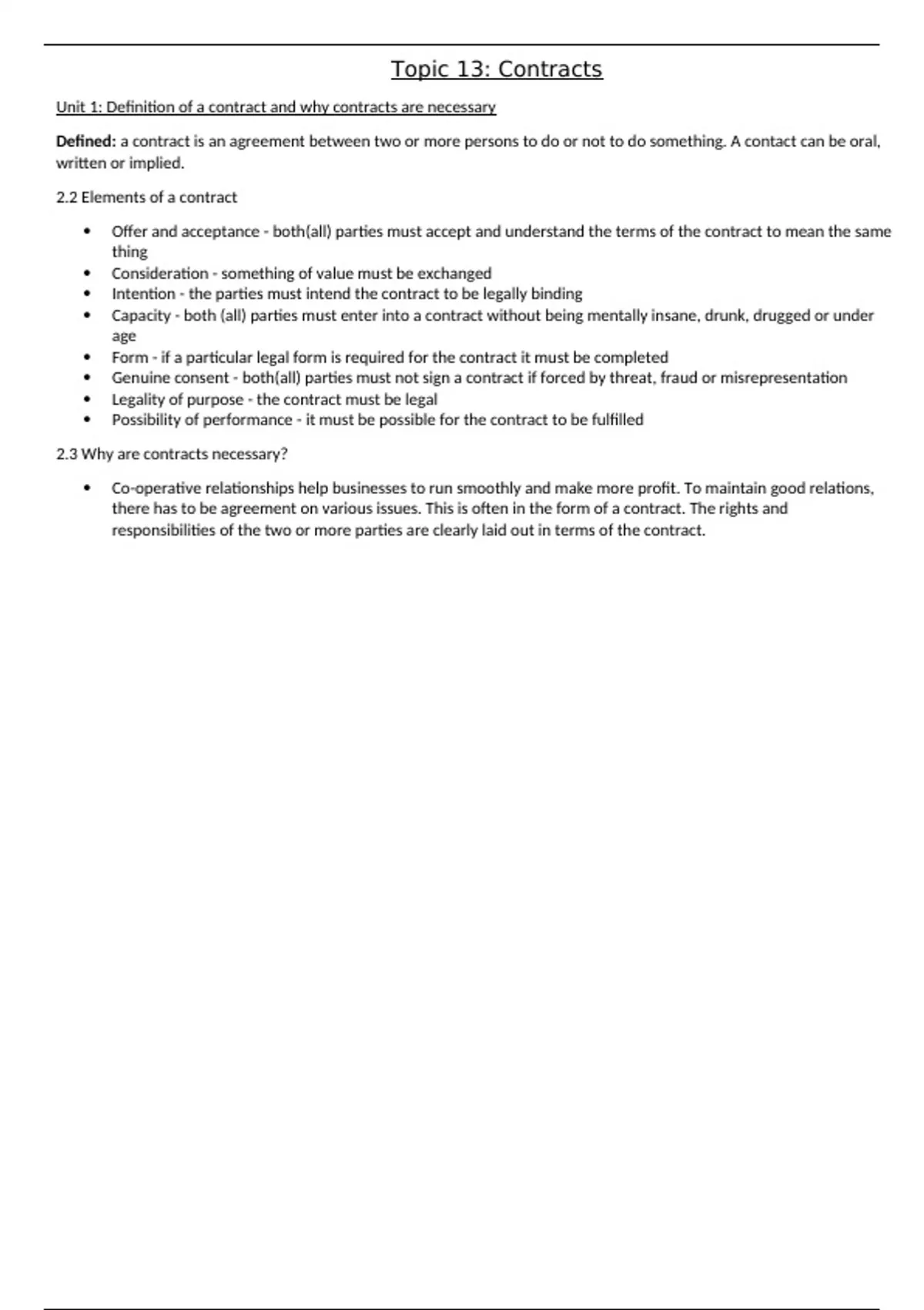 This is a summary on Topic 13: Contracts. I achieved distinctions for the subject by using these notes and believe they will be beneficial.