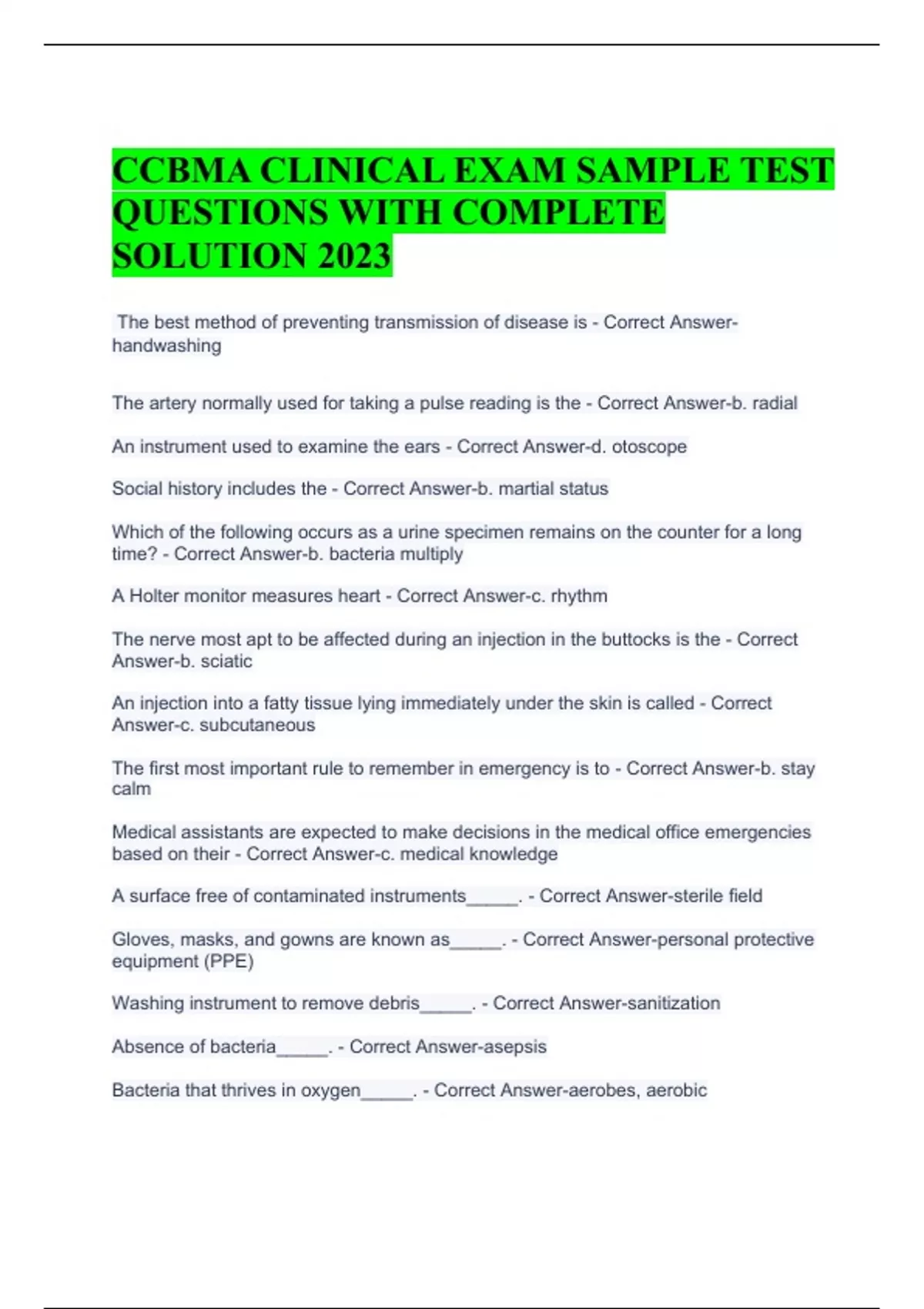 CCBMA CLINICAL EXAM SAMPLE TEST QUESTIONS WITH COMPLETE SOLUTION 2023
