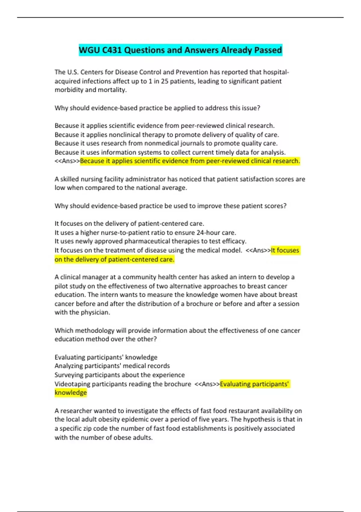 The U.S. Centers for Disease Control and Prevention has reported that hospital-acquired infections affect up to 1 in 25 patients, leading to significant patient morbidity and mortality. Why should evidence-based practice be applied to address this issue? Because it applies scientific evidence from peer-reviewed clinical research. Because it applies nonclinical therapy to promote delivery of quality of care. Because it uses research from nonmedical journals to promote quality care. Because it uses information systems to collect current timely data for analysis. <<Ans>>Because it applies scientific evidence from peer-reviewed clinical research. A skilled nursing facility administrator has noticed that patient satisfaction scores are low when compared to the national average. Why should evidence-based practice be used to improve these patient scores? It focuses on the delivery of patient-centered care. It uses a higher nurse-to-patient ratio to ensure 24-hour care. It uses newly approved pharmaceutical therapies to test efficacy. It focuses on the treatment of disease using the medical model. <<Ans>>It focuses on the delivery of patient-centered care. A clinical manager at a community health center has asked an intern to develop a pilot study on the effectiveness of two alternative approaches to breast cancer education. The intern wants to measure the knowledge women have about breast cancer before and after the distribution of a brochure or before and after a session with the physician. Which methodology will provide information about the effectiveness of one cancer education method over the other? Evaluating participants' knowledge Analyzing participants' medical records Surveying participants about the experience Videotaping participants reading the brochure <<Ans>>Evaluating participants' knowledge A researcher wanted to investigate the effects of fast food restaurant availability on the local adult obesity epidemic over a period of five years. The hypothesis is that in a specific zip code the number of fast food establishments is positively associated with the number of obese adults. All fast food locations in a certain zip code have been identified, and physicians have been contacted to provide each patient's de-identified age, gender, height, weight, and body mass index (BMI). Patients will be placed in groups according to their weight and height. Which type of research was conducted? Qualitative case study Qualitative cohort study Quantitative case study Quantitative cohort study <<Ans>>Quantitative cohort study The vice president of nursing at a large hospital is reviewing patient satisfaction scores from a recent survey that asked a series of questions about how patients felt about the care received. Which type of survey methodology was utilized in this study? Qualitative Quantitative Experimental Mixed-methods <<Ans>>Quantitative A pharmaceutical company is currently testing a new drug. The physicians in the study do not know if they are prescribing the new drug or a previously used medication. Which type of research methodology is being used? Case study Cohort study Case control study Randomized control trial <<Ans>>Randomized control trial