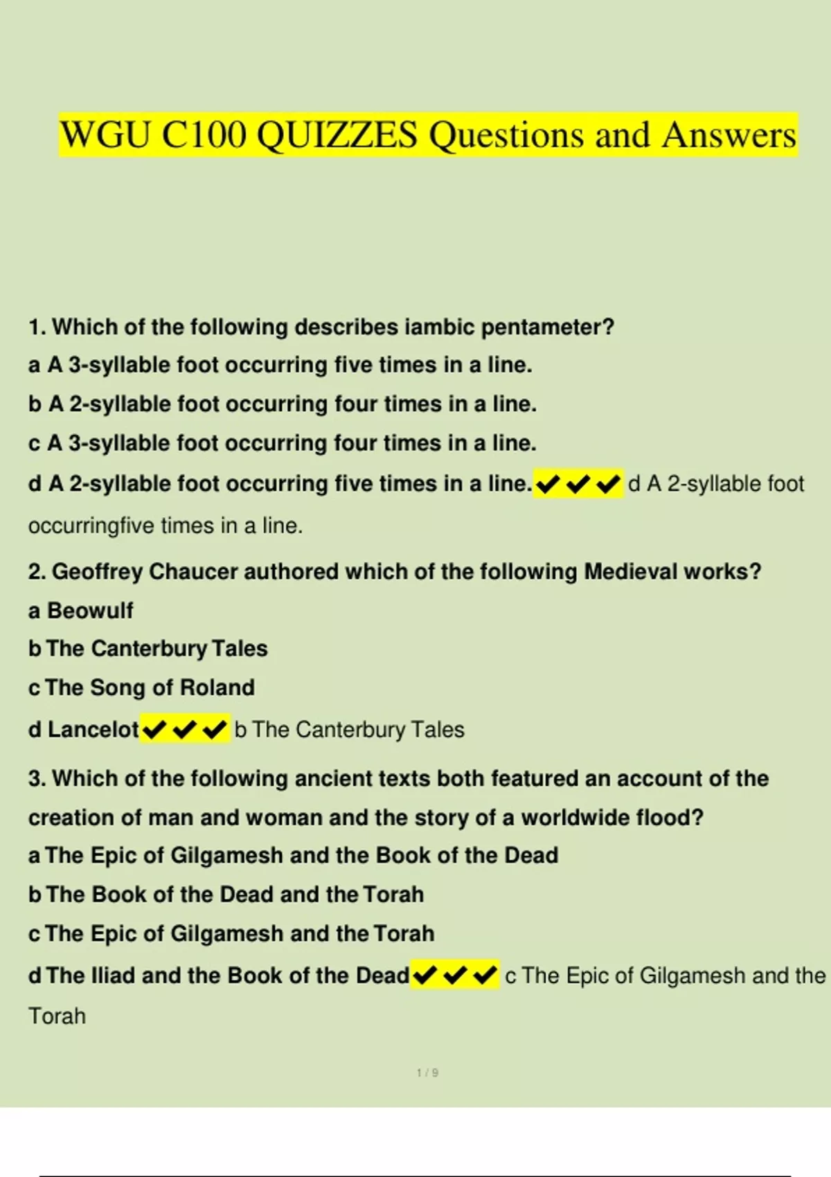 1. Which of the following describes iambic pentameter? a A 3-syllable foot occurring five times in a line. b A 2-syllable foot occurring four times in a line. c A 3-syllable foot occurring four times in a line. d A 2-syllable foot occurring five times in a line. d A 2-syllable foot occurringfive times in a line. 2. Geoffrey Chaucer authored which of the following Medieval works? a Beowulf b The Canterbury Tales c The Song of Roland d Lancelot b The Canterbury Tales 3. Which of the following ancient texts both featured an account of the creation of man and woman and the story of a worldwide flood? a The Epic of Gilgamesh and the Book of the Dead b The Book of the Dead and the Torah c The Epic of Gilgamesh and the Torah d The Iliad and the Book of the Dead c The Epic of Gilgamesh and the Torah2 / 9 4. Which of the following describes a 14-line poem with a rhyming couplet at the end? a Lyric b Sonnet c Ode d Elegy b Sonnet 5. A Woman singing against orchestral background is an example of a(n) . Rondo Nocturne Fugue Aria Aria 6. Consider this stanza of poetry from Robert Burns ("A Red, Red Rose") O, my luve's like a red, red rose That's newly sprung in June. O, my luve is like the melodie That's sweetly played in tune.