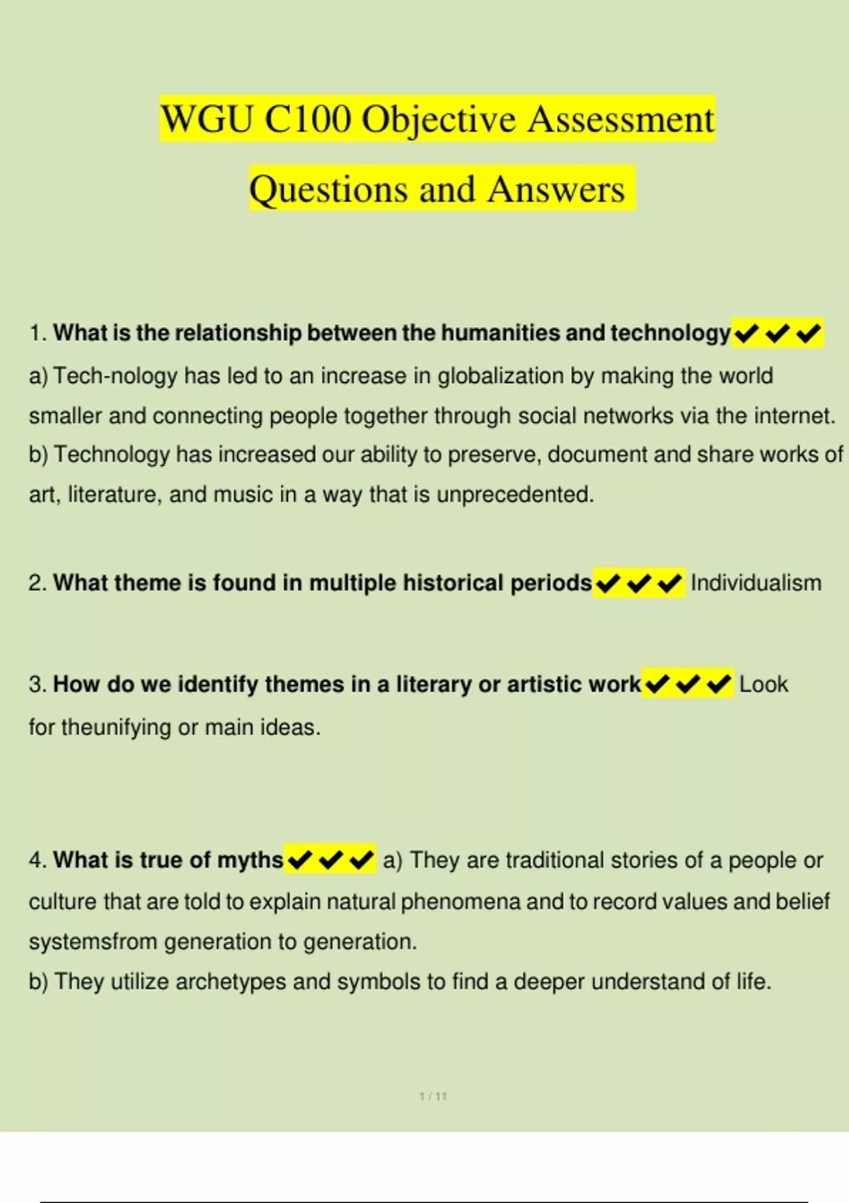 1. What is the relationship between the humanities and technology a) Tech-nology has led to an increase in globalization by making the world smaller and connecting people together through social networks via the internet. b) Technology has increased our ability to preserve, document and share works of art, literature, and music in a way that is unprecedented. 2. What theme is found in multiple historical periods Individualism 3. How do we identify themes in a literary or artistic work Look for theunifying or main ideas. 4. What is true of myths a) They are traditional stories of a people or culture that are told to explain natural phenomena and to record values and belief systemsfrom generation to generation. b) They utilize archetypes and symbols to find a deeper understand of life.2 / 11 5. Part of public ceremony, ritual, or entertainment dates back to the earliest human civilizations.: Dance 6. Stems from the early Greeks, with their development of tragedy and comedy.: Theater 7. Concerned with the interplay of form and function.: Architecture 8. Can include any system of ethics, values, and beliefs.: Religion 9. Which discipline of the Humanities is primarily concerned with critical inquiry and reasoned argument Philosophy 10. The Bayeux Tapestry's depiction of the Norman Conquest of England fulfills which purpose of art Art as political propaganda 11. What are the Humanities The study of how the human race understands and documents the human experience through creative contributions in art, music,literature, philosophy, religion, dance, etc