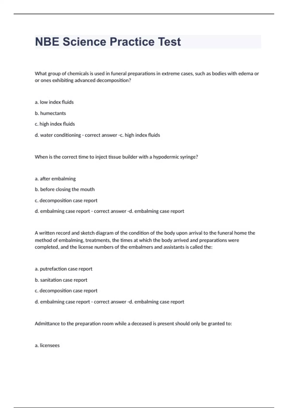 What group of chemicals is used in funeral preparations in extreme cases, such as bodies with edema or or ones exhibiting advanced decomposition? a. low index fluids b. humectants c. high index fluids d. water conditioning c. high index fluids When is the correct time to inject tissue builder with a hypodermic syringe? a. after embalming b. before closing the mouth c. decomposition case report d. embalming case report d. embalming case report A written record and sketch diagram of the condition of the body upon arrival to the funeral home the method of embalming, treatments, the times at which the body arrived and preparations were completed, and the license numbers of the embalmers and assistants is called the: a. putrefaction case report b. sanitation case report c. decomposition case report d. embalming case report d. embalming case report Admittance to the preparation room while a deceased is present should only be granted to: a. licensees b. those authorized by the family or the state c. pre-need counselors d. both a and b d. both b and c The difference between the potential pressure reading and the actual pressure reading indicates the: a. vacuum pressure b. rate of flow c. differential pressure d. both b and c d. both b and c