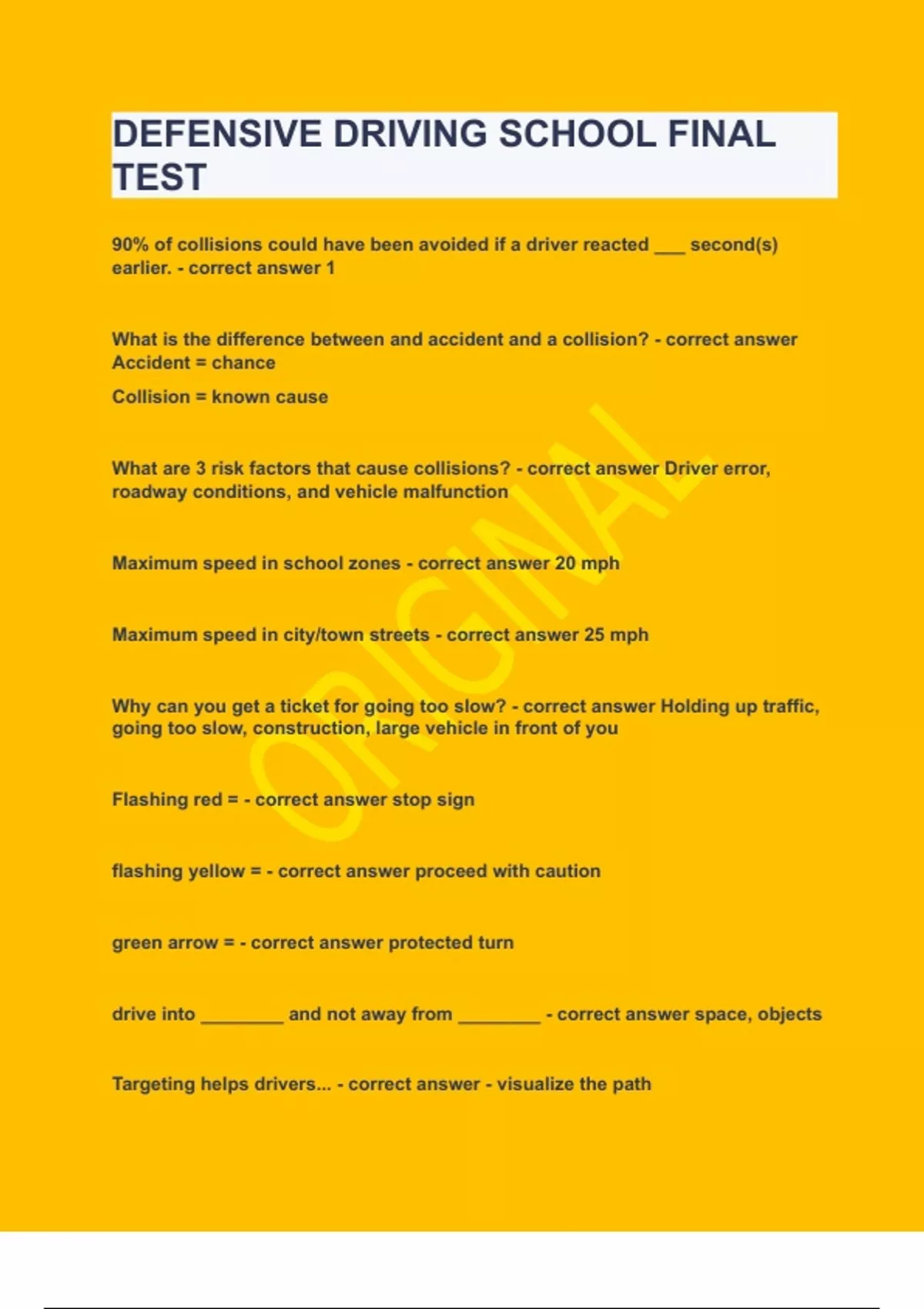 DEFENSIVE DRIVING SCHOOL FINAL TEST|UPDATED&VERIFIED|100% SOLVED|GUARANTEED SUCCESS