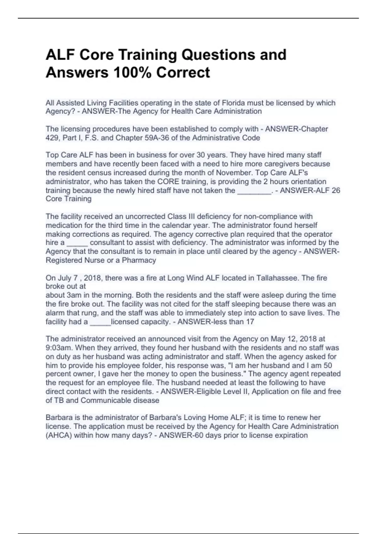 ALF Core Training Questions and Answers 100% Correct ALF Core Training Questions and Answers 100% Correct ALF Core Training Questions and Answers 100% Correct ALF Core Training Questions and Answers 100% Correct ALF Core Training Questions and Answers 100% Correct ALF Core Training Questions and Answers 100% Correct All Assisted Living Facilities operating in the state of Florida must be licensed by which Agency? - ANSWER-The Agency for Health Care Administration The licensing procedures have been established to comply with - ANSWER-Chapter 429, Part I, F.S. and Chapter 59A-36 of the Administrative Code Top Care ALF has been in business for over 30 years. They have hired many staff members and have recently been faced with a need to hire more caregivers because the resident census increased during the month of November. Top Care ALF's administrator, who has taken the CORE training, is providing the 2 hours orientation training because the newly hired staff have not taken the ________. - ANSWER-ALF 26 Core Training The facility received an uncorrected Class III deficiency for non-compliance with medication for the third time in the calendar year. The administrator found herself making corrections as required. The agency corrective plan required that the operator hire a _____ consultant to assist with deficiency. The administrator was informed by the Agency that the consultant is to remain in place until cleared by the agency - ANSWER-Registered Nurse or a Pharmacy On July 7 , 2018, there was a fire at Long Wind ALF located in Tallahassee. The fire broke out at about 3am in the morning. Both the residents and the staff were asleep during the time the fire broke out. The facility was not cited for the staff sleeping because there was an alarm that rung, and the staff was able to immediately step into action to save lives. The facility had a _____licensed capacity. - ANSWER-less than 17 The administrator received an announced visit from the Agency on May 12, 2018 at 9:03am. When they arrived, they found her husband with the residents and no staff was on duty as her husband was acting administrator and staff. When the agency asked for him to provide his employee folder, his response was, "I am her husband and I am 50 percent owner, I gave her the money to open the business." The agency agent repeated