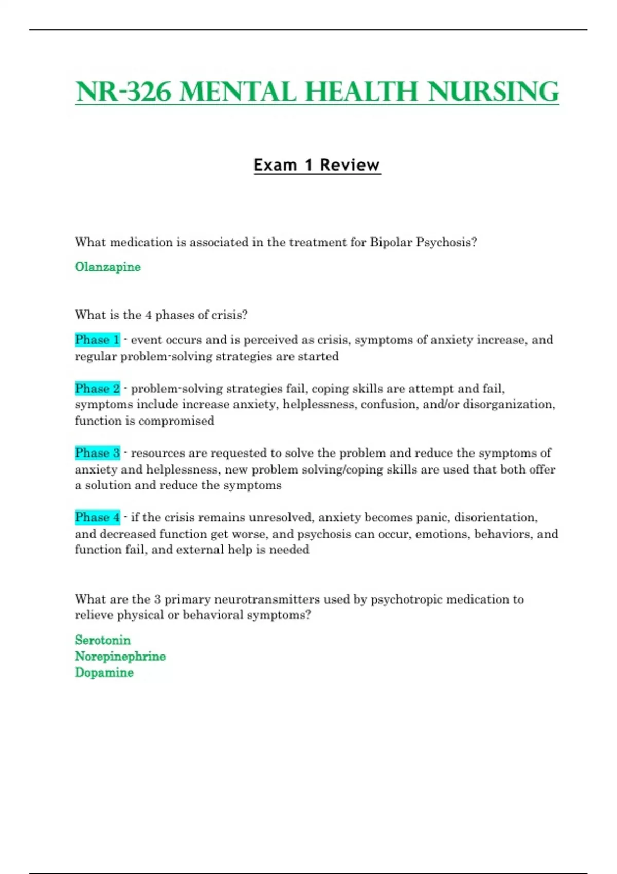 Exam 1 Review - NR326 / NR 326 (Latest 2023 / 2024) : Mental Health Nursing - Chamberlain