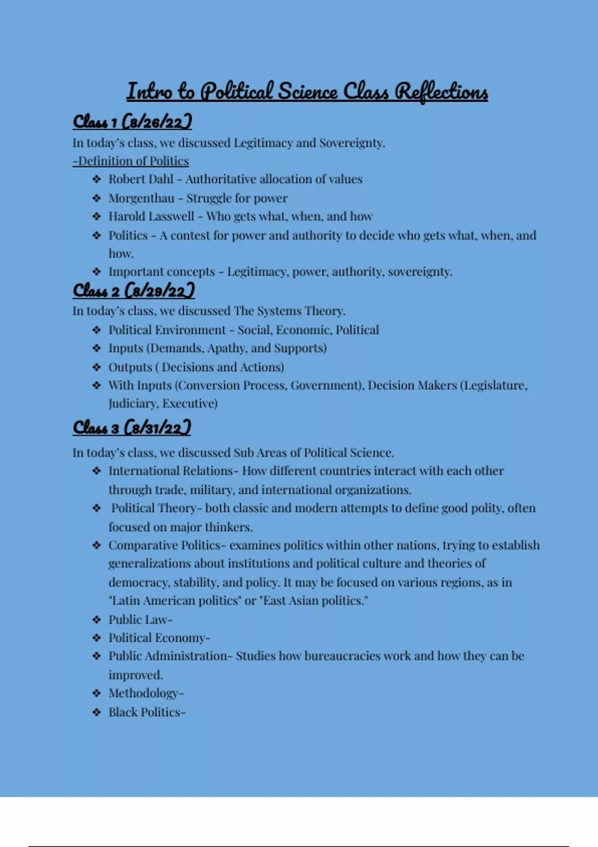Class reflection and notes