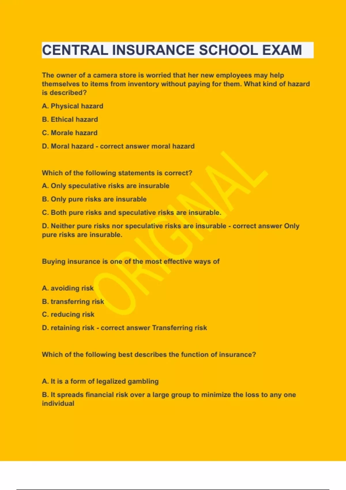 CENTRAL INSURANCE SCHOOL EXAM|UPDATED&VERIFIED|100% SOLVED|GUARANTEED SUCCESS