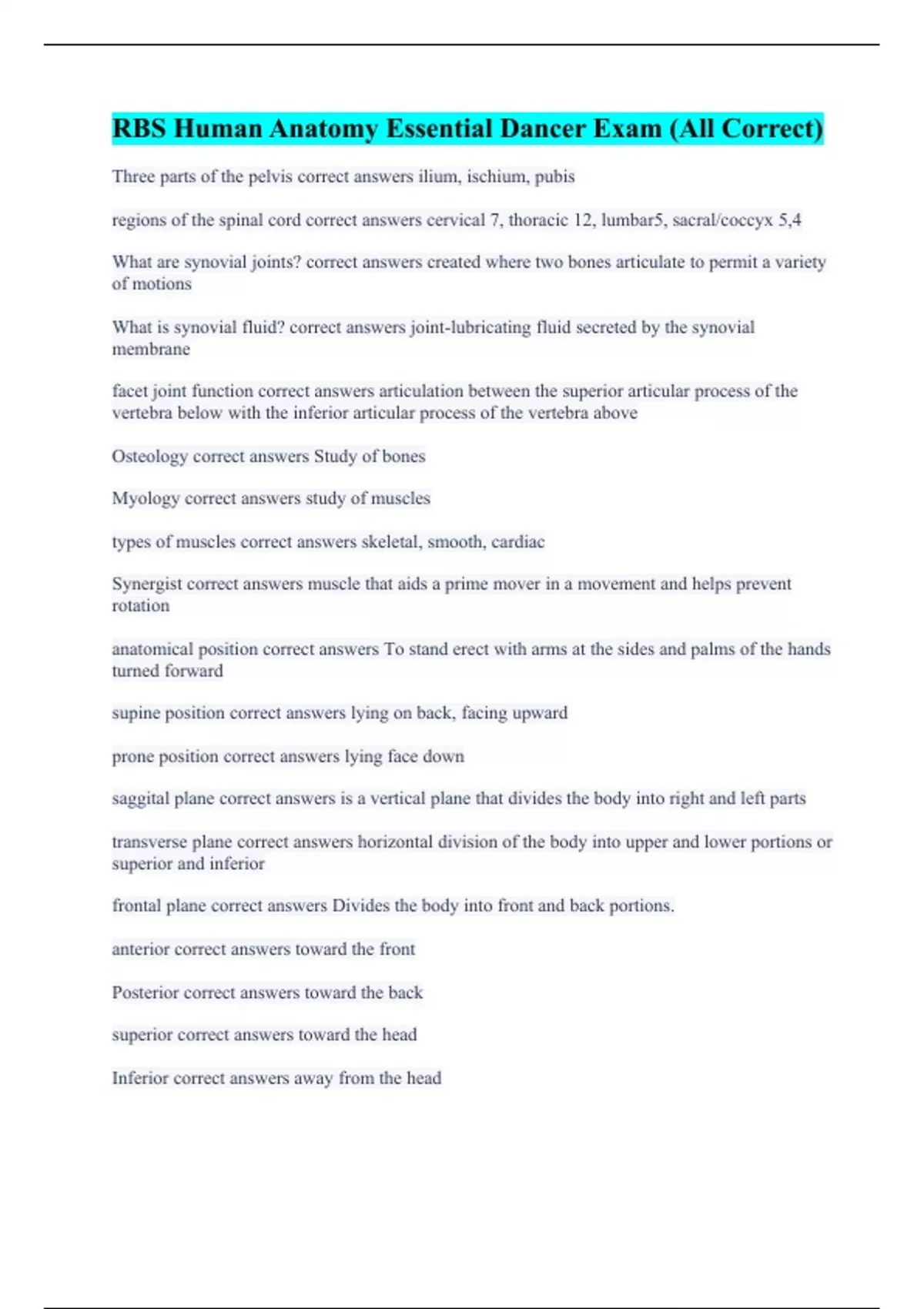 RBS Human Anatomy Essential Dancer Exam (All Correct)