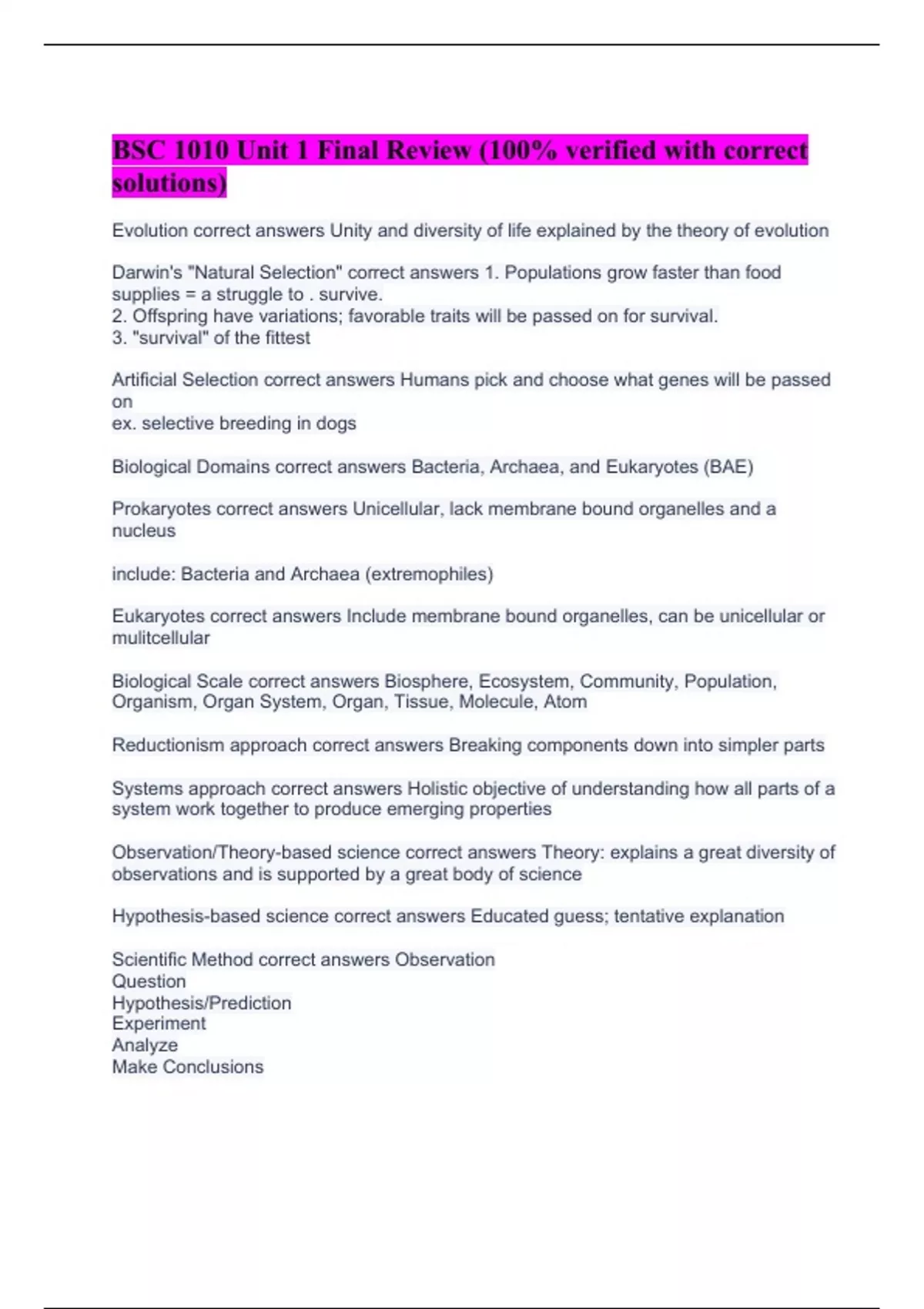 Evolution correct answers Unity and diversity of life explained by the theory of evolution Darwin's "Natural Selection" correct answers 1. Populations grow faster than food supplies = a struggle to . survive. 2. Offspring have variations; favorable traits will be passed on for survival. 3. "survival" of the fittest Artificial Selection correct answers Humans pick and choose what genes will be passed on ex. selective breeding in dogs Biological Domains correct answers Bacteria, Archaea, and Eukaryotes (BAE) Prokaryotes correct answers Unicellular, lack membrane bound organelles and a nucleus include: Bacteria and Archaea (extremophiles) Eukaryotes correct answers Include membrane bound organelles, can be unicellular or mulitcellular Biological Scale correct answers Biosphere, Ecosystem, Community, Population, Organism, Organ System, Organ, Tissue, Molecule, Atom Reductionism approach correct answers Breaking components down into simpler parts Systems approach correct answers Holistic objective of understanding how all parts of a system work together to produce emerging properties Observation/Theory-based science correct answers Theory: explains a great diversity of observations and is supported by a great body of science Hypothesis-based science correct answers Educated guess; tentative explanation Scientific Method correct answers Observation Question Hypothesis/Prediction Experiment Analyze Make Conclusions